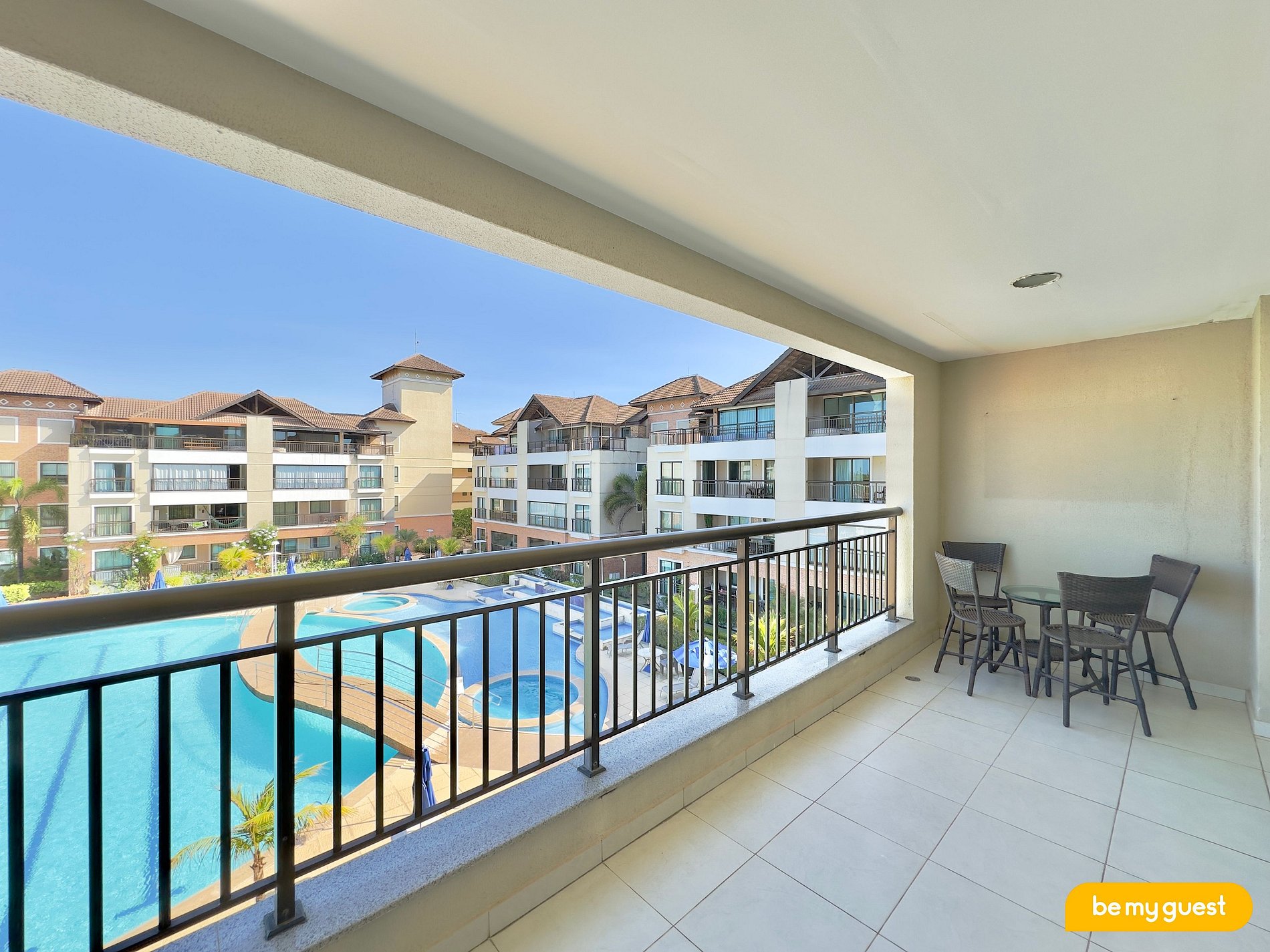 - Suíte principal com cama queen, TV, ar-condicionado, varanda e vista da piscina