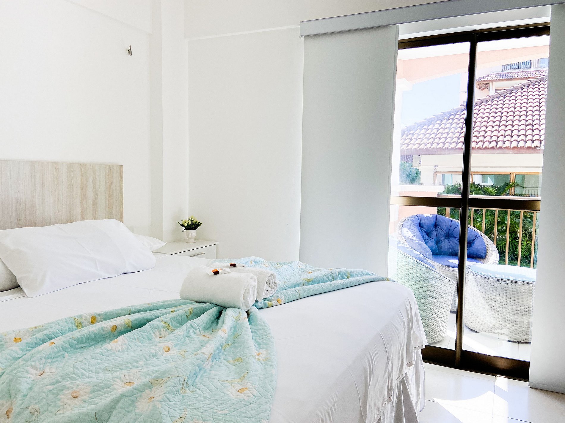 O apartamento tem uma suíte com cama de casal e um quarto com duas camas de solteiro. Uma sala espaçosa com televisão e sofá, uma cozinha super equipada e uma varanda bem ampla para aproveitar com os amigos e a família.