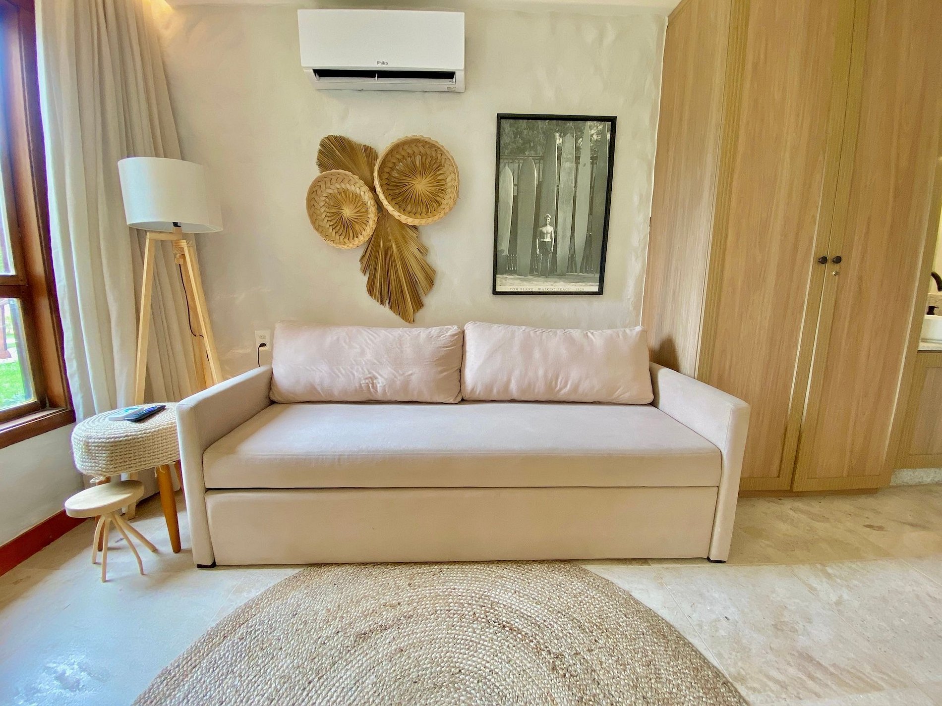 - Sala de Estar com ar condicionado e um sofá-cama ultra confortável, além de uma linda mesa oval para 6 pessoas + TV Smart moderna