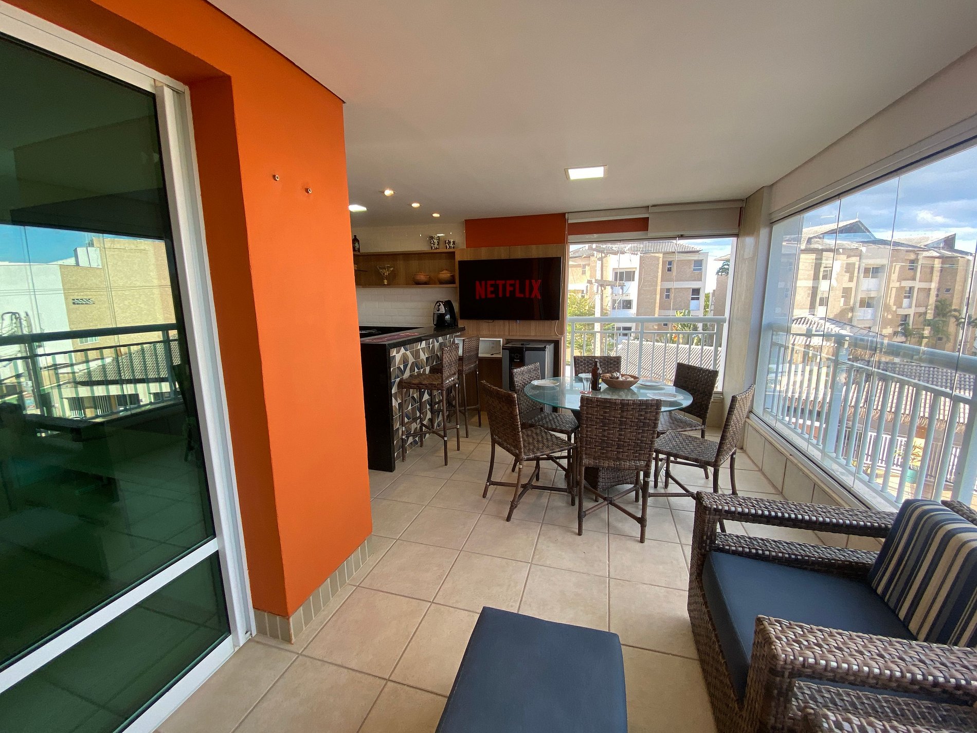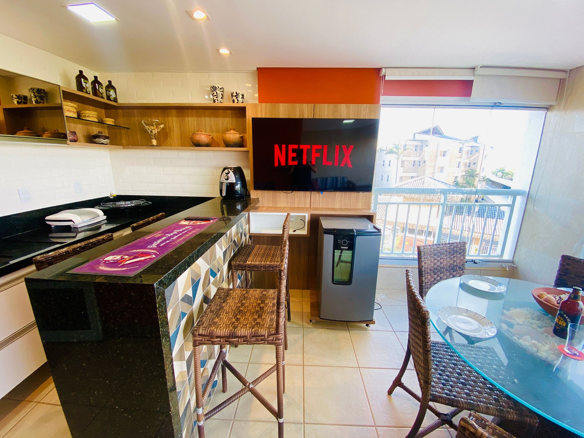 > Varanda ampla com TV Smart + Sofá + Área para Churrasco + Mesa de Jantar