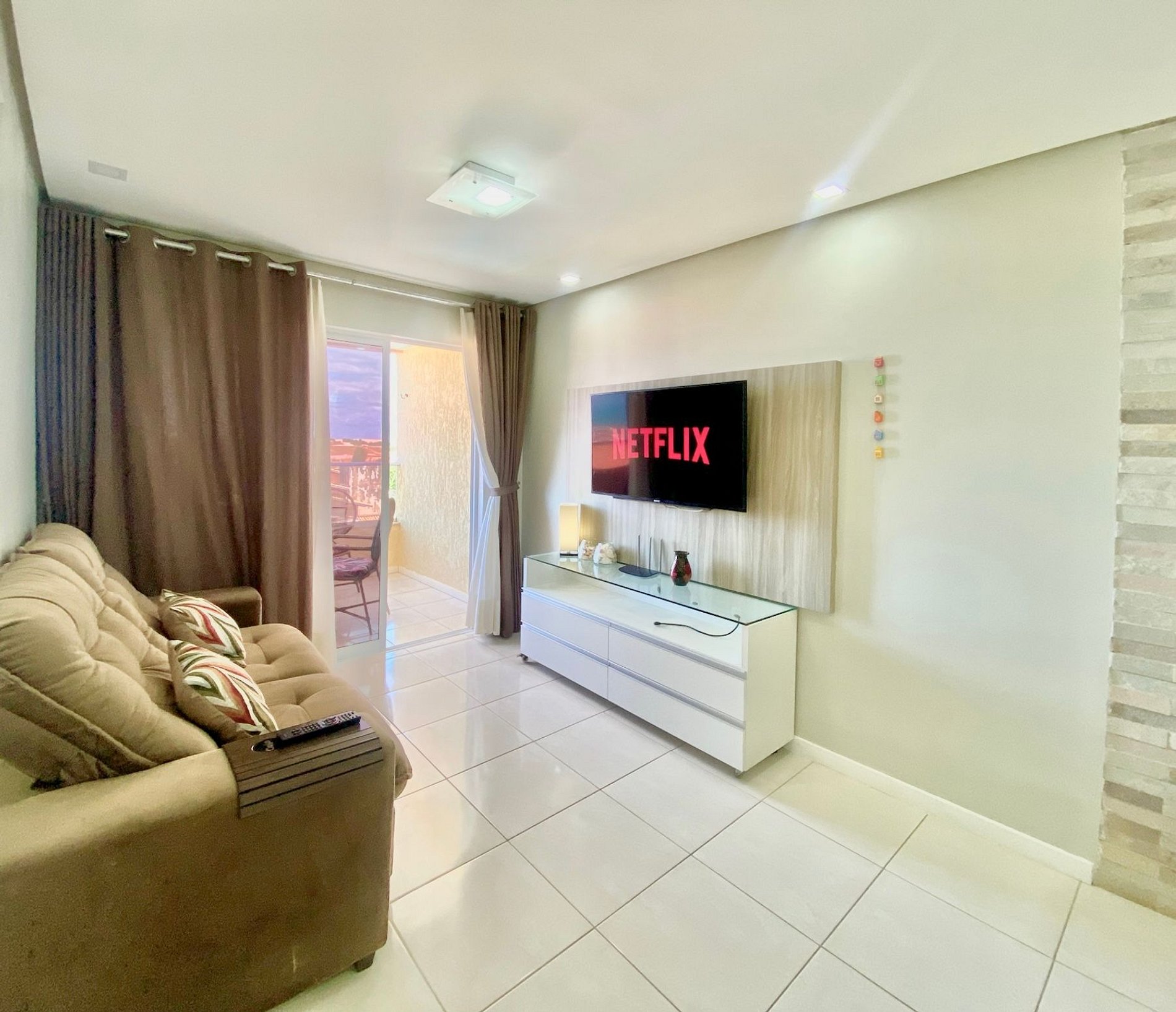 - Sala de Estar ampla com Ar Condicionado + TV Smart + Sofá ultra confortável + Espaço para Home Office e Mesa de Jantar