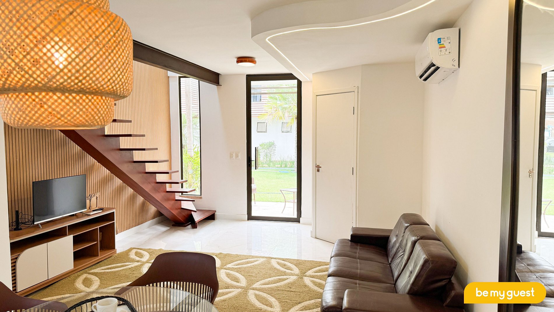 - Sala de Estar decorada e ampla com sofá e TV Smart.