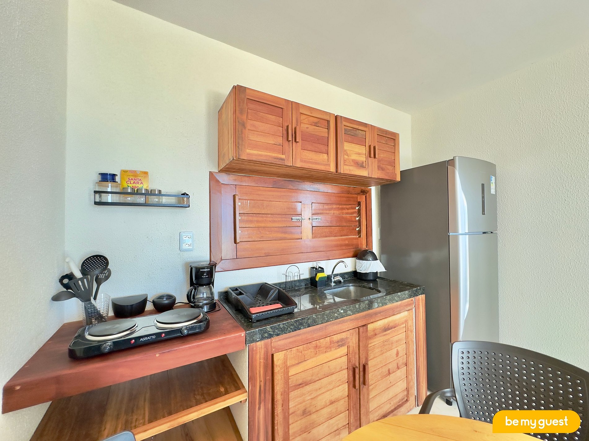 - Cozinha integrada à sala, com mesa de jantar e utensílios essenciais