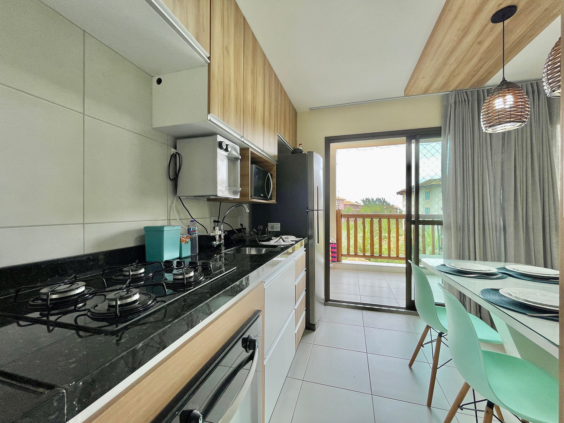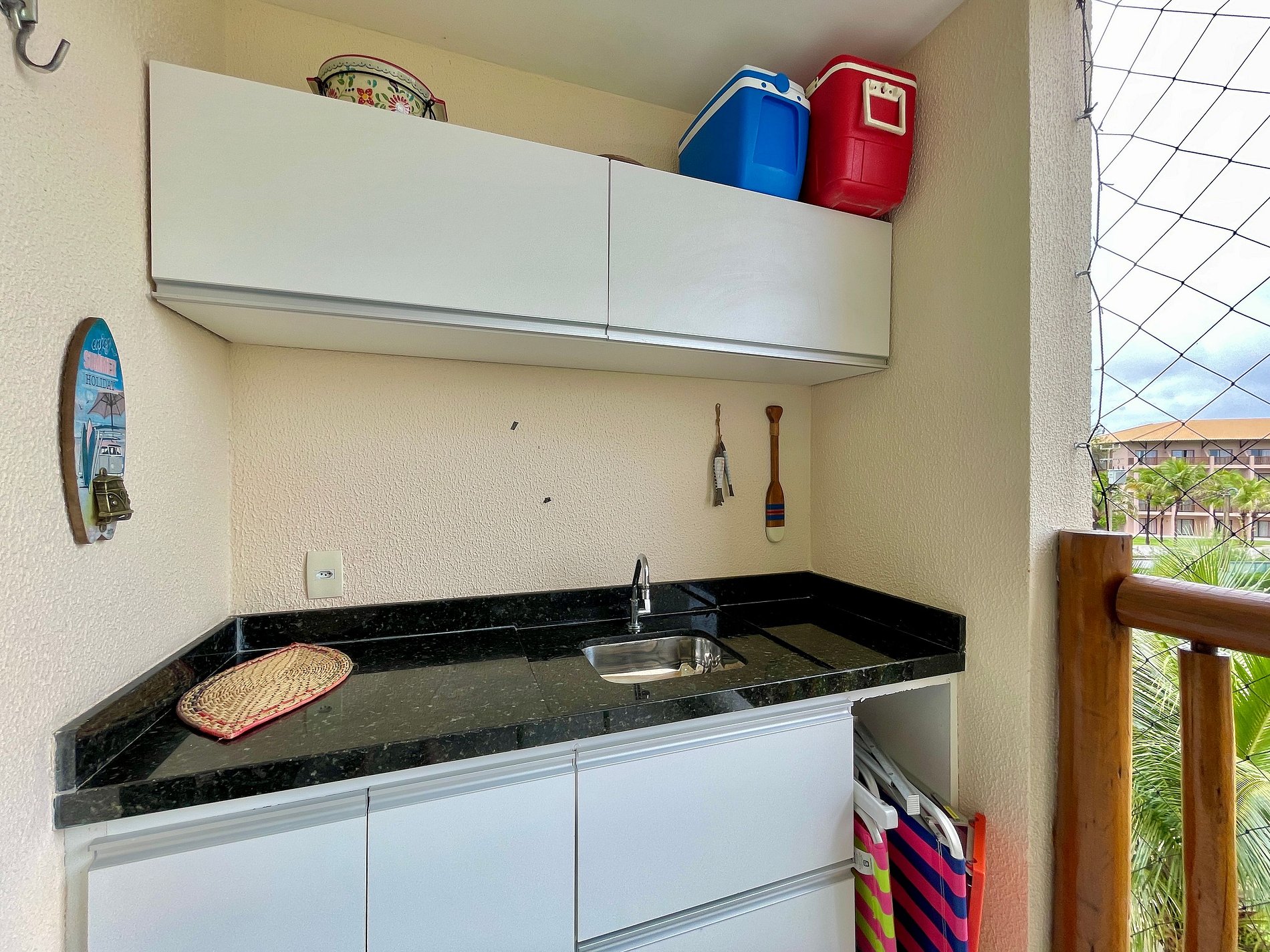 > Varanda ampla com mesa para 4 pessoas, cadeiras e coolers para levar a beira do mar na praia.