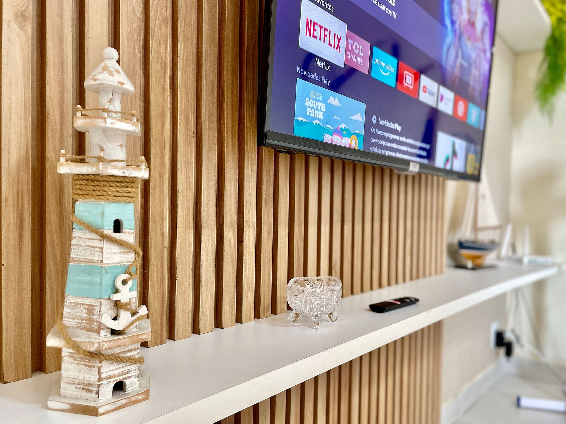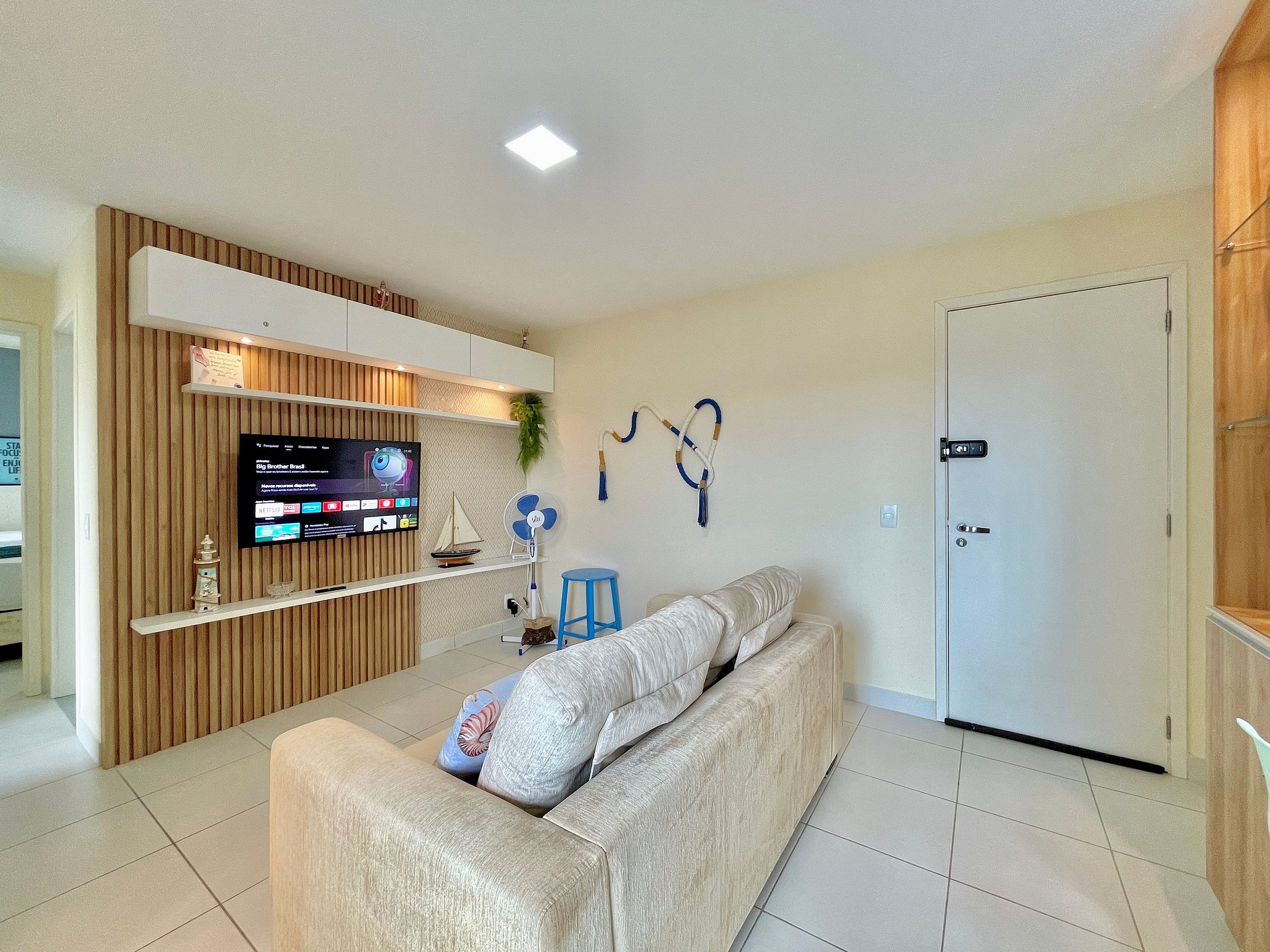 > Sala de Estar com Sofá ultra confortável + TV Smart + Mesa de Jantar