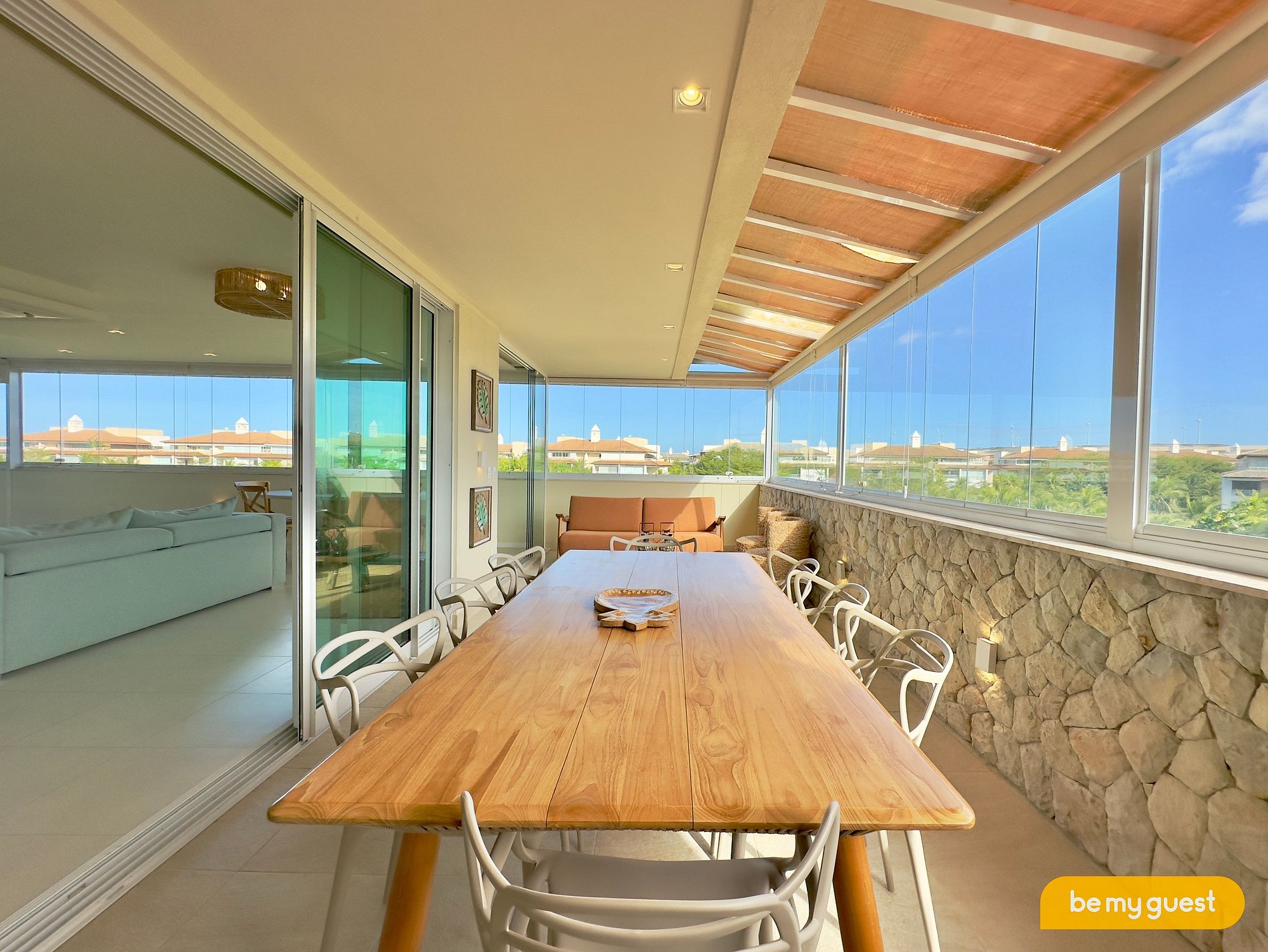 - Varanda extensa com belíssima decoração em conjunto com a Sala de Estar, possui espaço para bebidas, sofá e ampla mesa de jantar