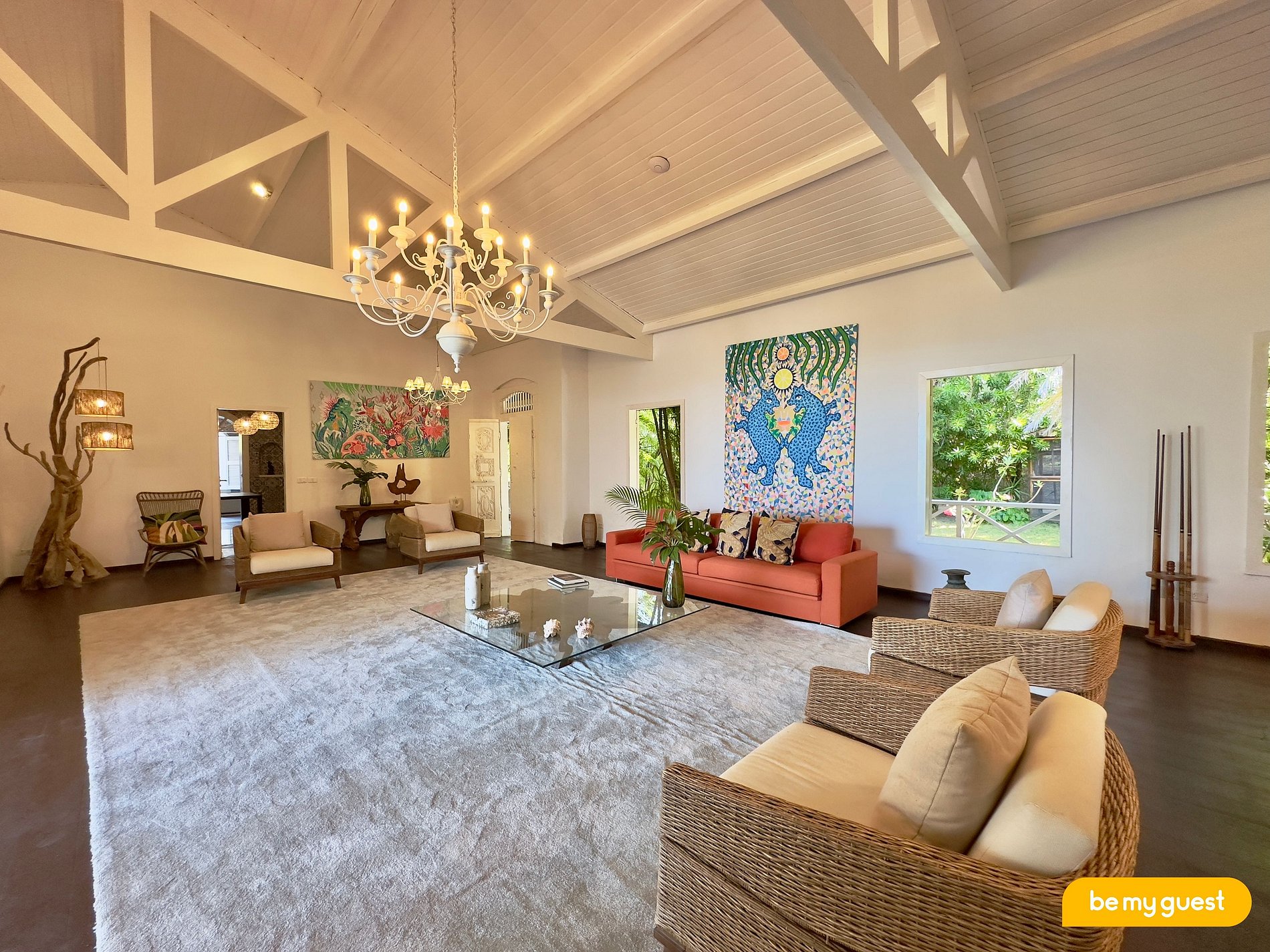 - Sala de estar principal con sofás, sillones, mesa de billar y piano
