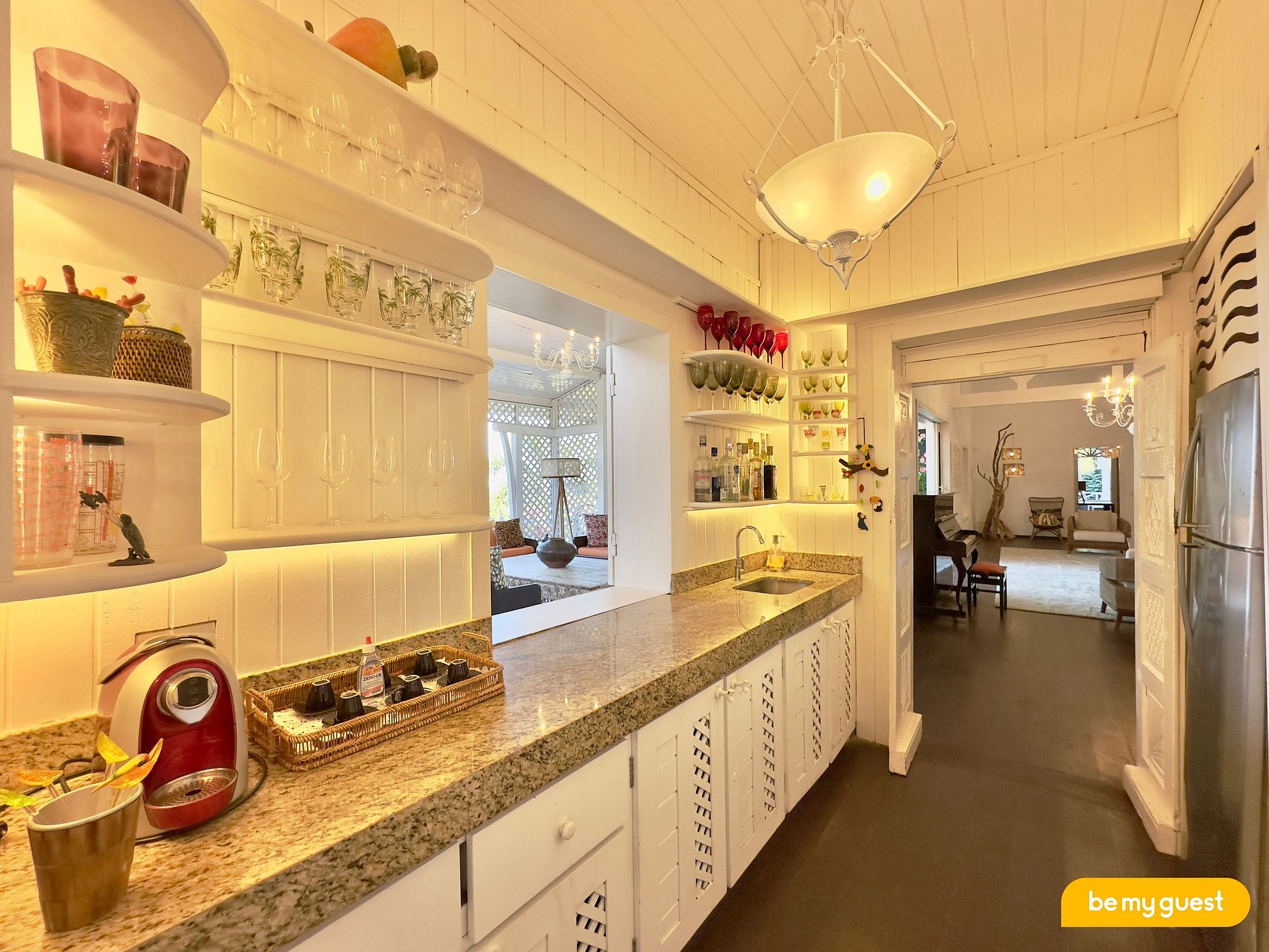 La cocina es amplia, moderna y está totalmente equipada. ¿Qué le parecería contar con un chef privado y un menú personalizado para su desayuno, almuerzo y cena en este espacio?