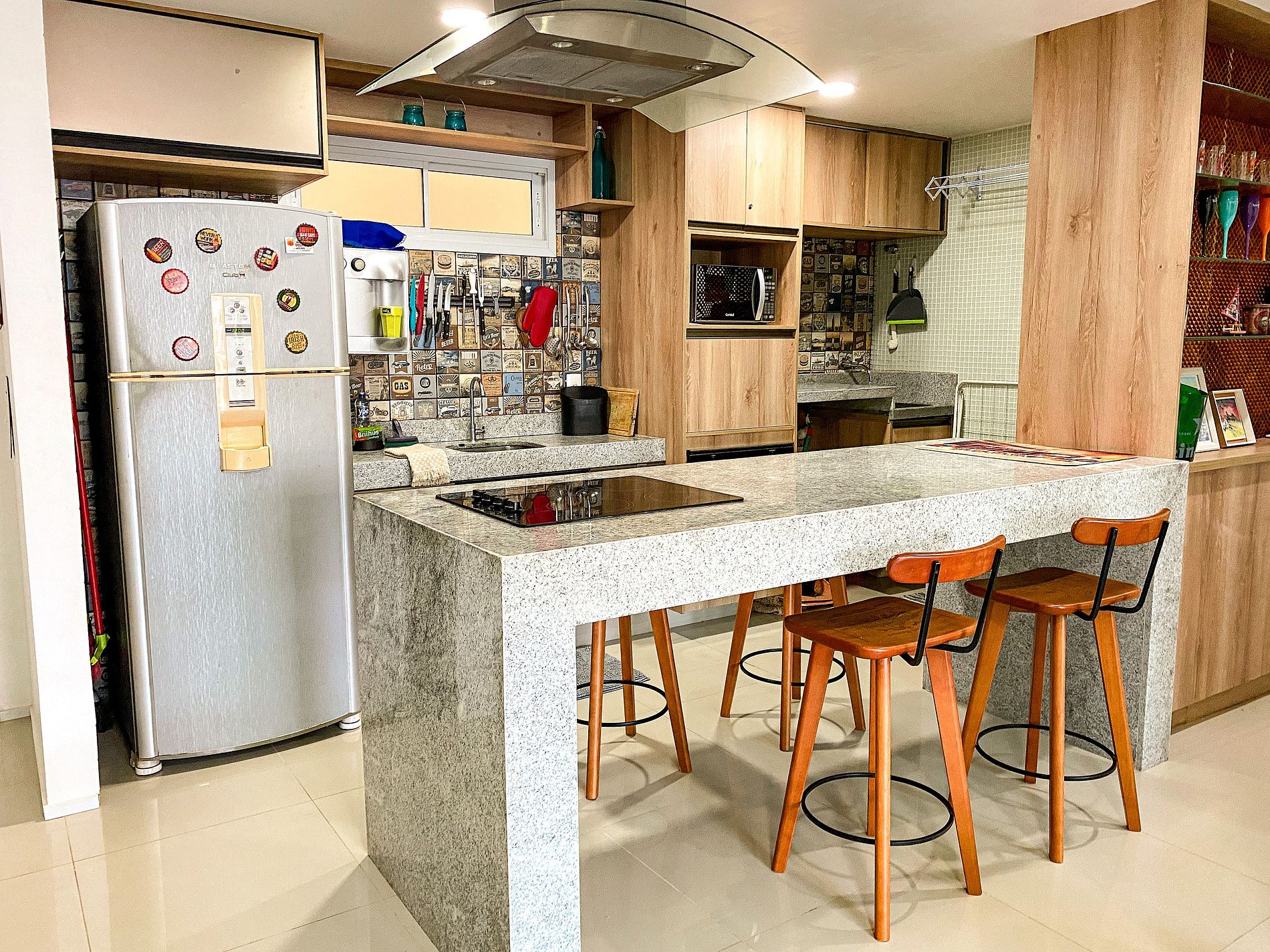 Varanda com mesa e cadeiras, cozinha estilo americano com todos utensílios, roupas de cama e banho e produtos de higiene pessoal.