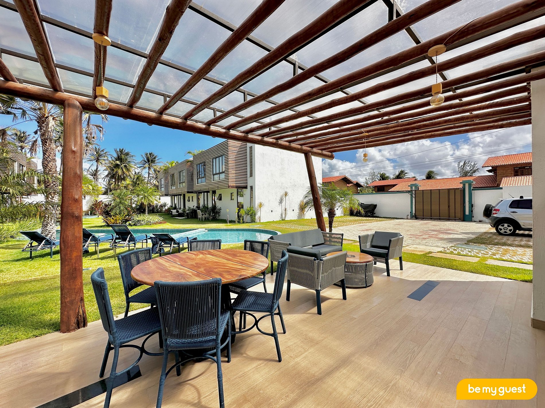 - Varanda planejada com churrasqueira, espreguiçadeira e chuveiro externo
