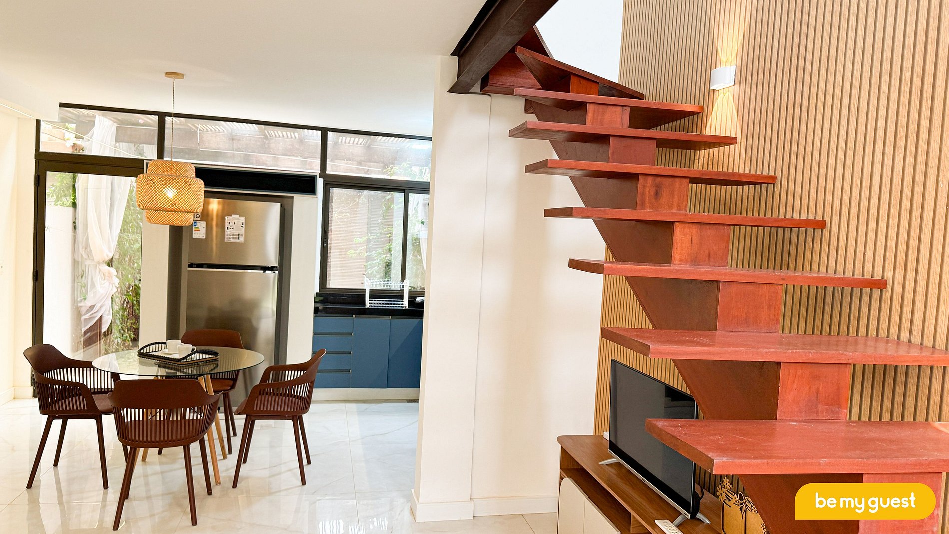 A acomodação é bem completa, fica bem localizada e possui uma garagem particular dentro do condomínio. A casa conta com: