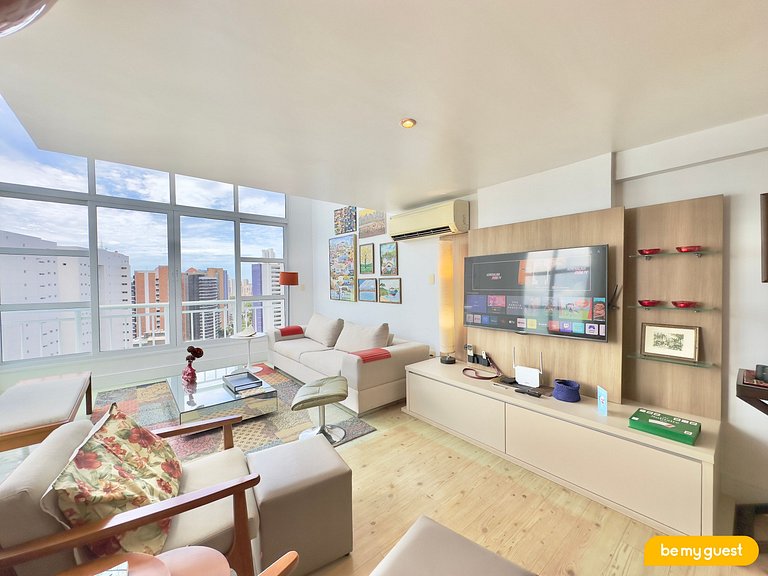 Apartamento modelo loft moderno, decorado e completo em excelente localização a apenas um quarteirão da Beira Mar de Fortaleza. A acomodação possui uma linda vista mar, totalmente climatizado e possui todas as comodidades ideais para sua estadia