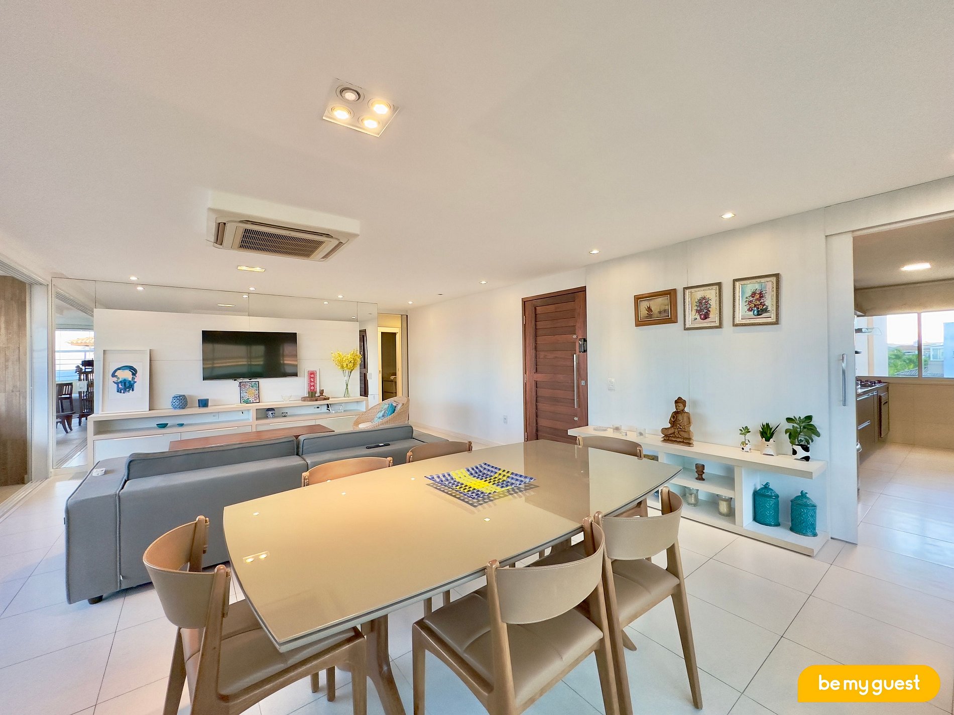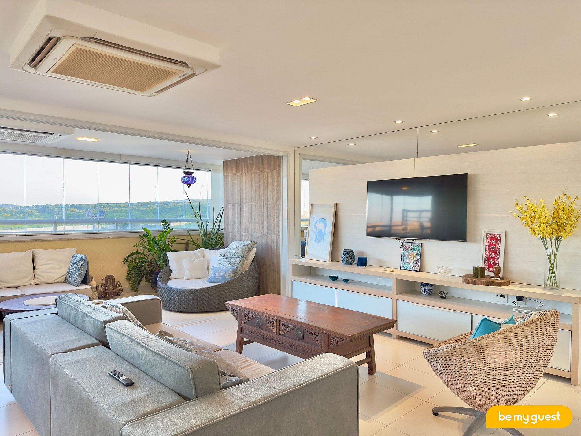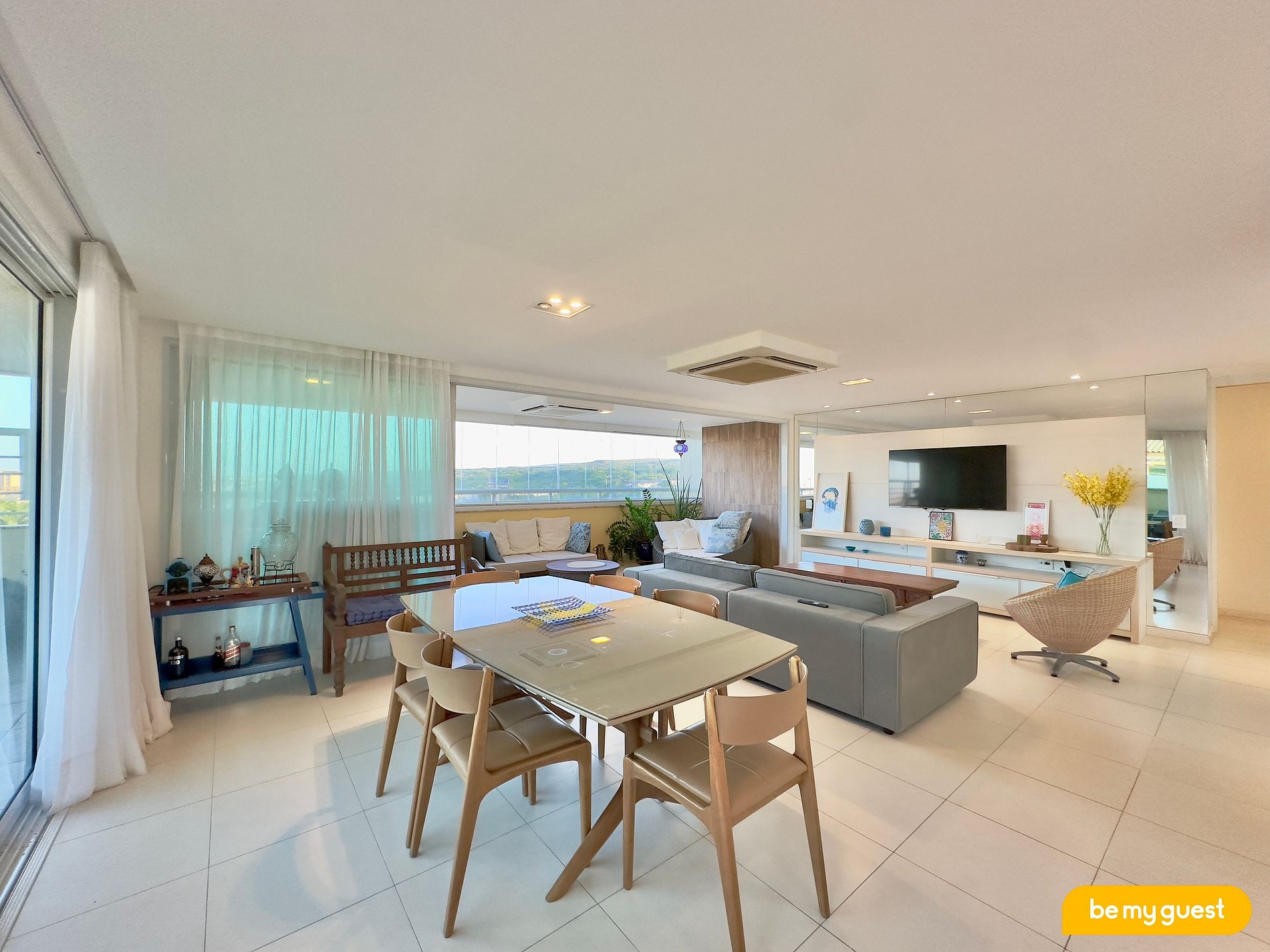 - Suíte Principal ampla com Cama King, espaço para trabalho e vista do campo de golfe- Suíte com cama Queen + 2 colchões de Solteiro- Suíte com cama Casal + 1 colchão de Solteiro- Sala de Estar super ampla, climatizada e com dois ambientes super bem decorados! Conta com uma TV Smart, sofás bem confortáveis e uma ampla mesa de jantar com uma vista do campo de golfe principal e vista do mar também- Varanda extensa com churrasqueira, mesa ampla e Jacuzzi com vista para o mar