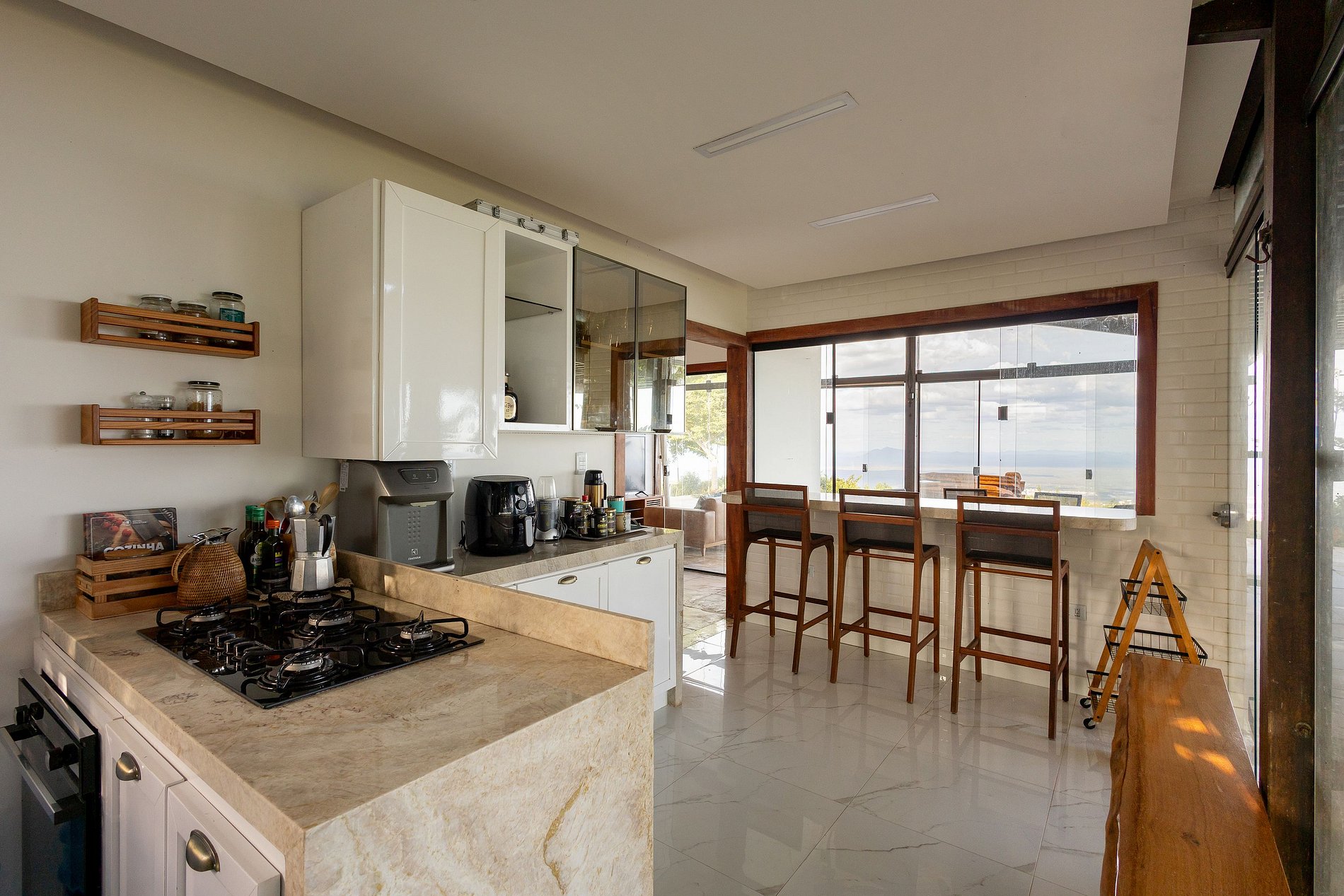 - Sala de estar integrada à cozinha, bem decorada e aconchegante