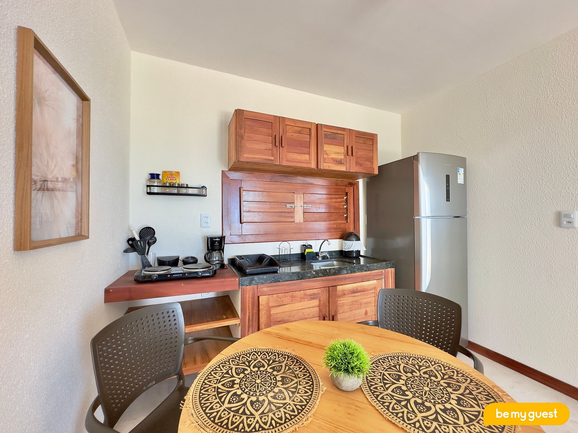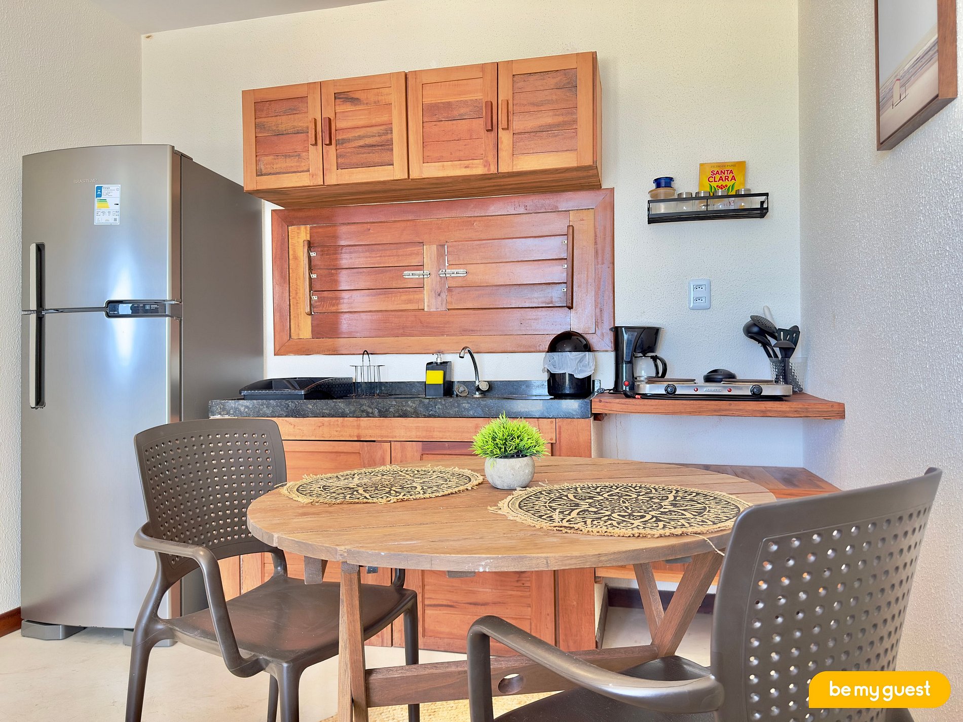 - Cozinha integrada à sala, com mesa de jantar e utensílios essenciais