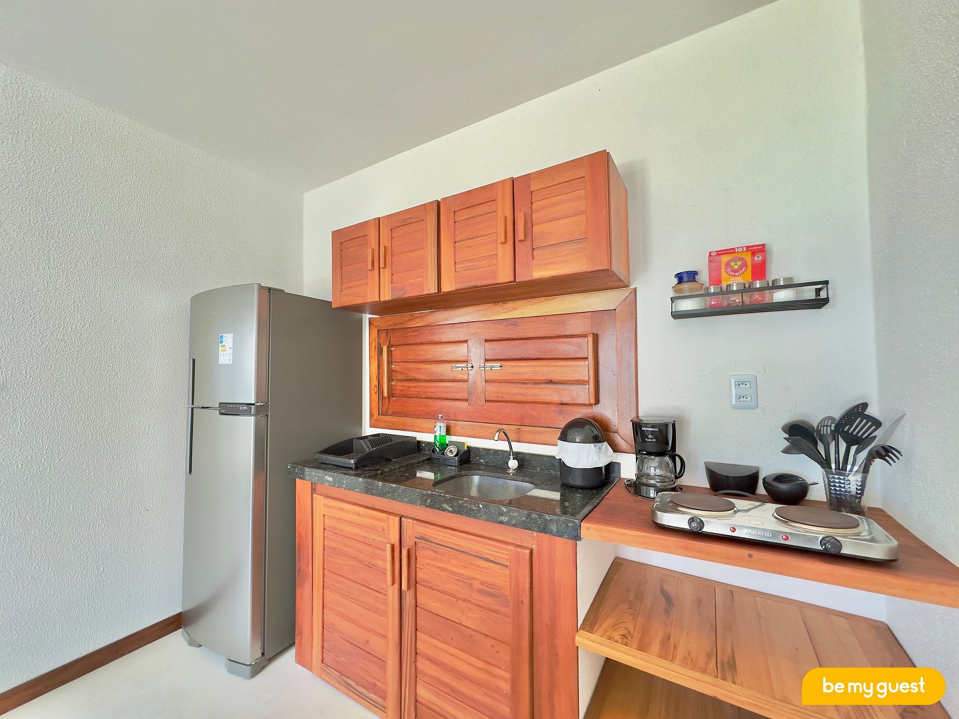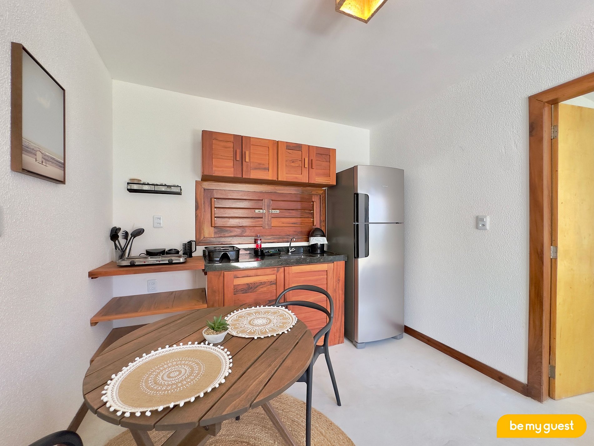 - Cozinha completa com mesa de jantar e utensílios essenciais