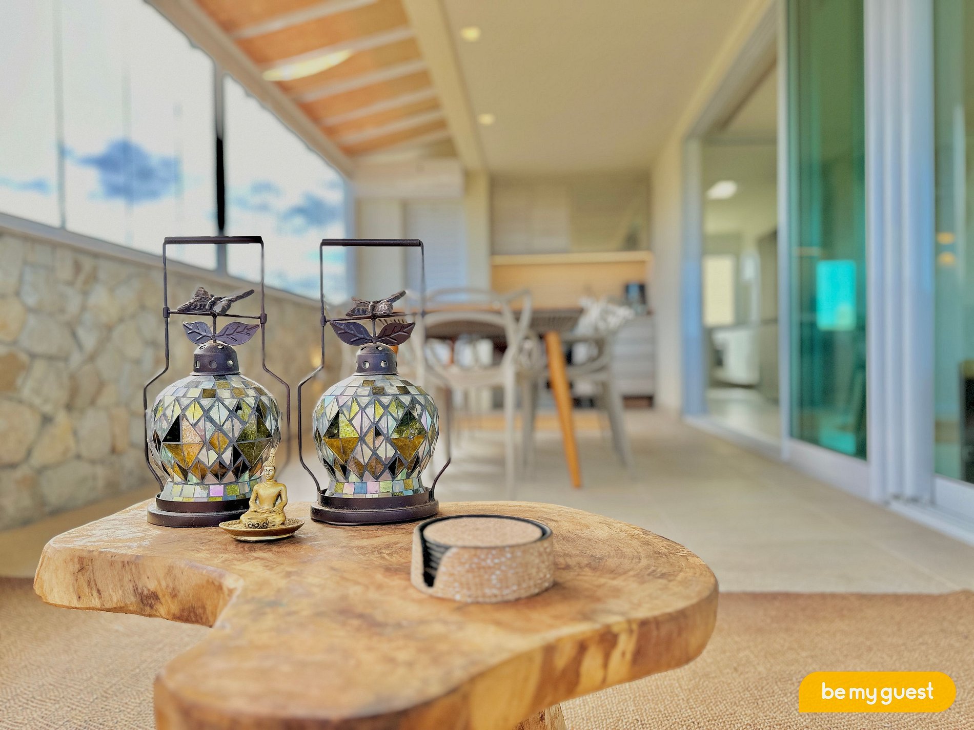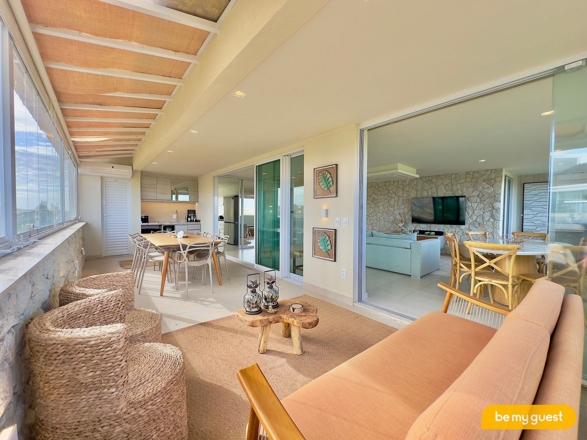 - Varanda extensa com belíssima decoração em conjunto com a Sala de Estar, possui espaço para bebidas, sofá e ampla mesa de jantar
