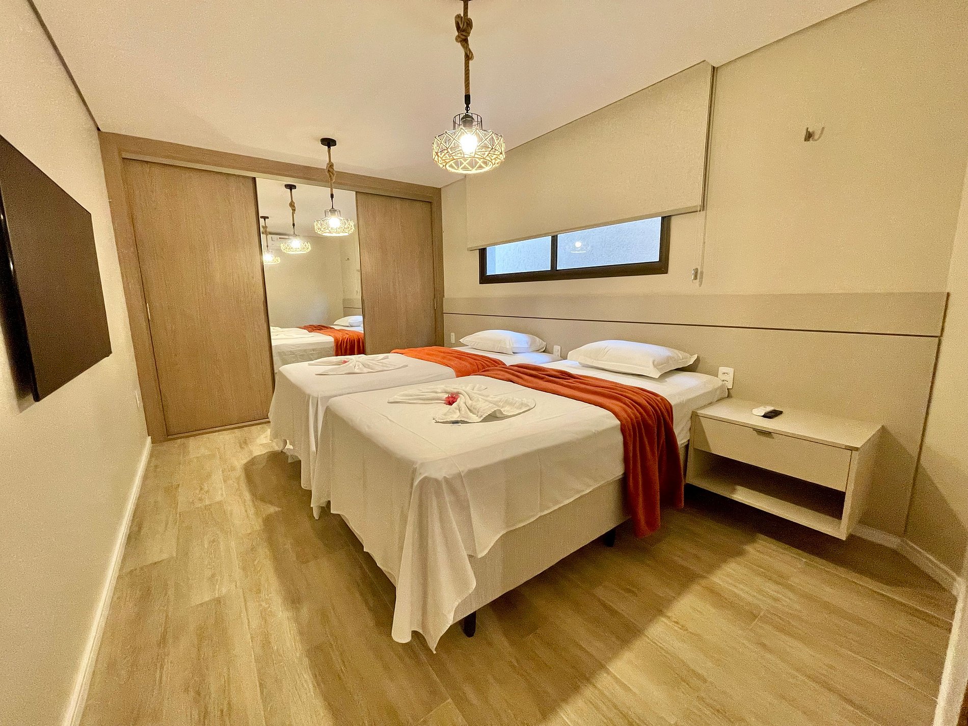 O apartamento possui dois quartos bem distribuídos. A suíte principal apresenta uma confortável cama queen-size, enquanto o quarto adjacente ao banheiro possui duas camas de solteiro. Ambos os quartos contam com armários espaçosos para guardar suas malas. Os banheiros também são equipados com chuveiros que fornecem água quente, garantindo um banho relaxante a qualquer momento.