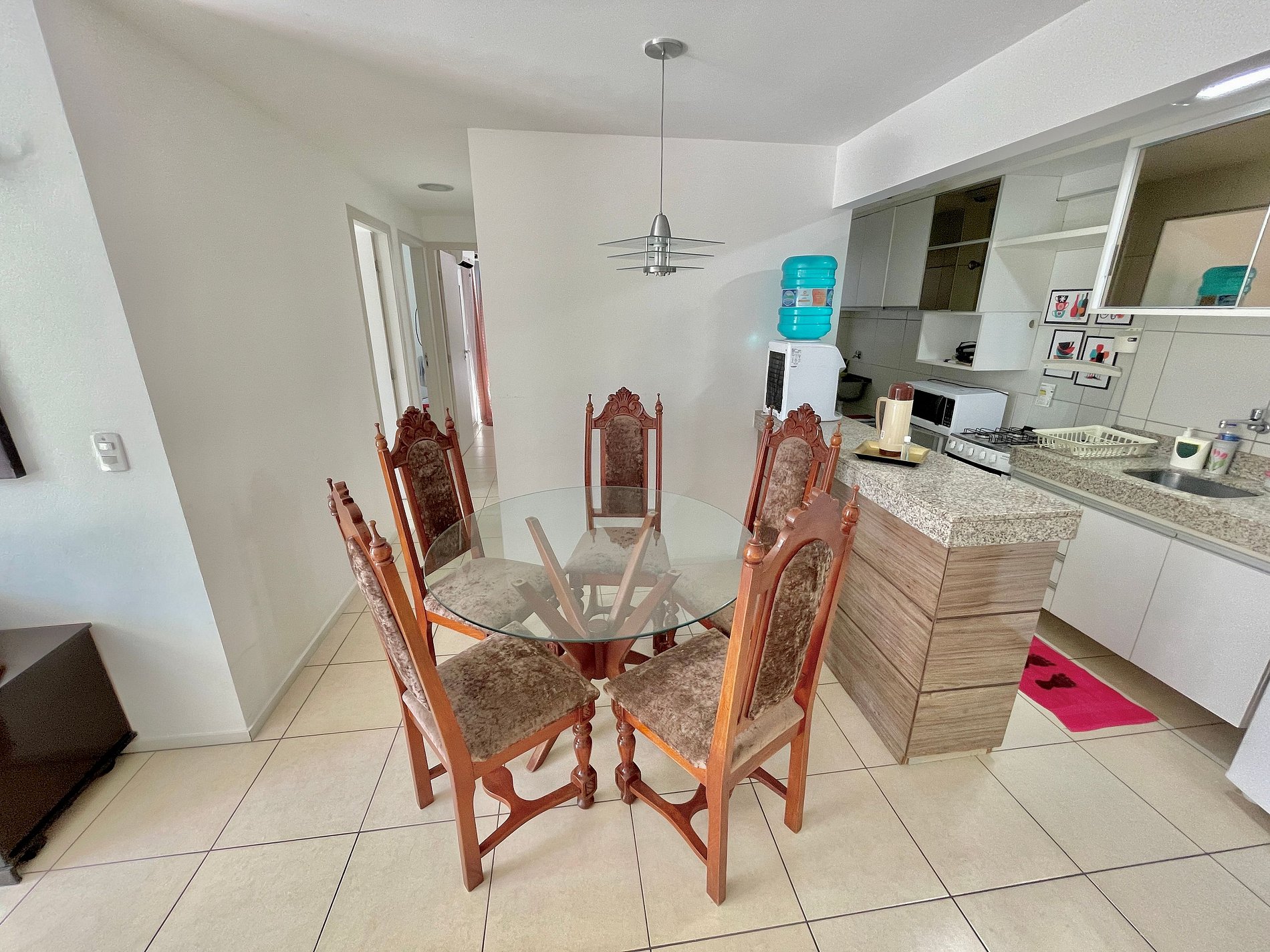 > Sala de Estar com vista para piscina e mesa de jantar para 5 pessoas