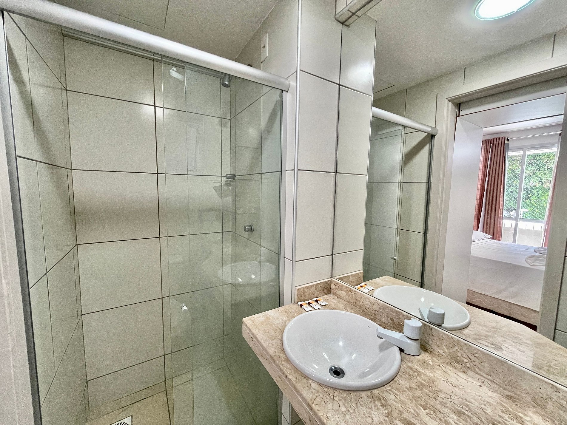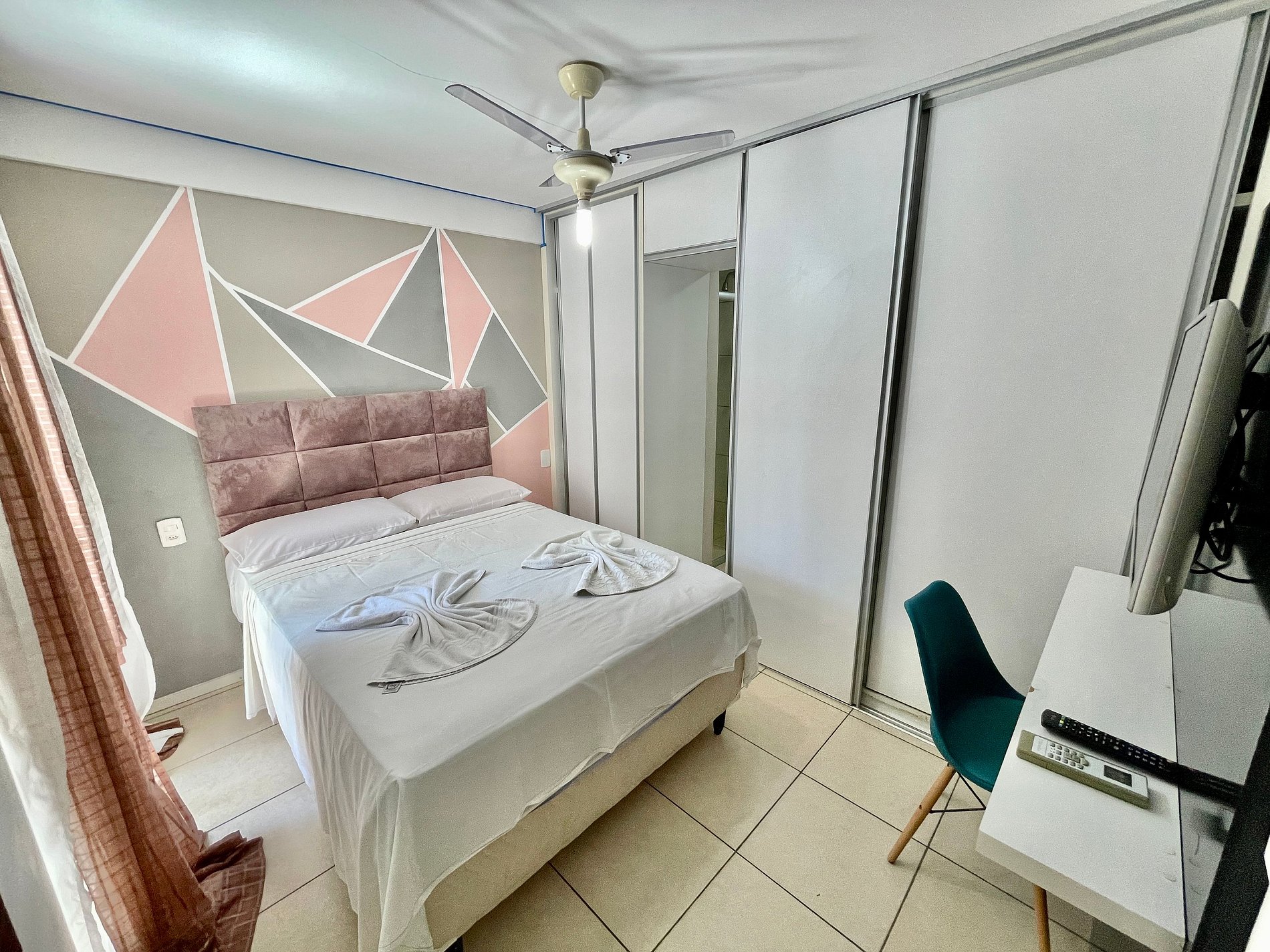 > Suíte com 1 cama Casal decorada com ar-condicionado, TV Smart e varanda privada