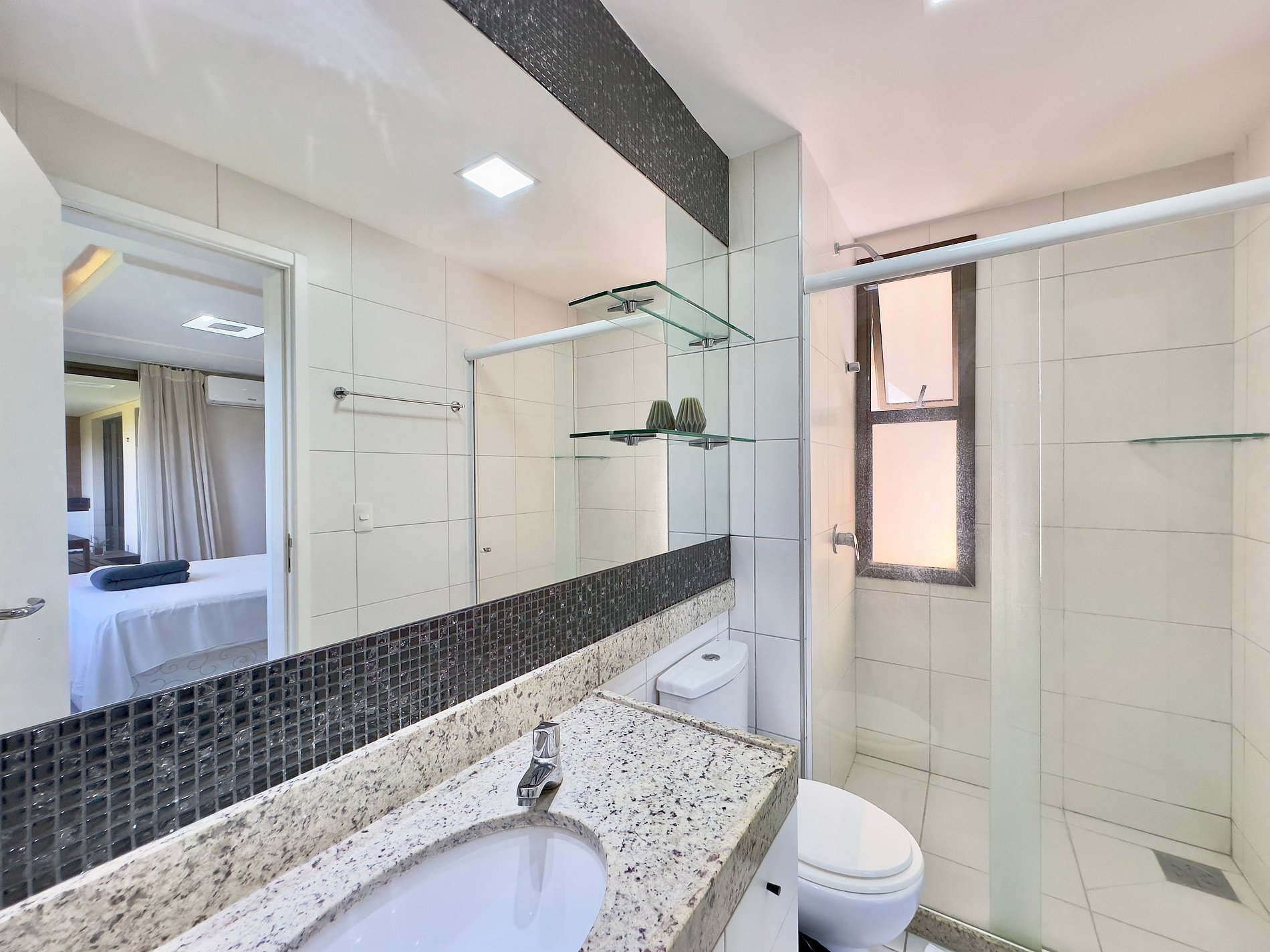 - Suíte Master: Cama Queen, ar-condicionado e varanda integrada