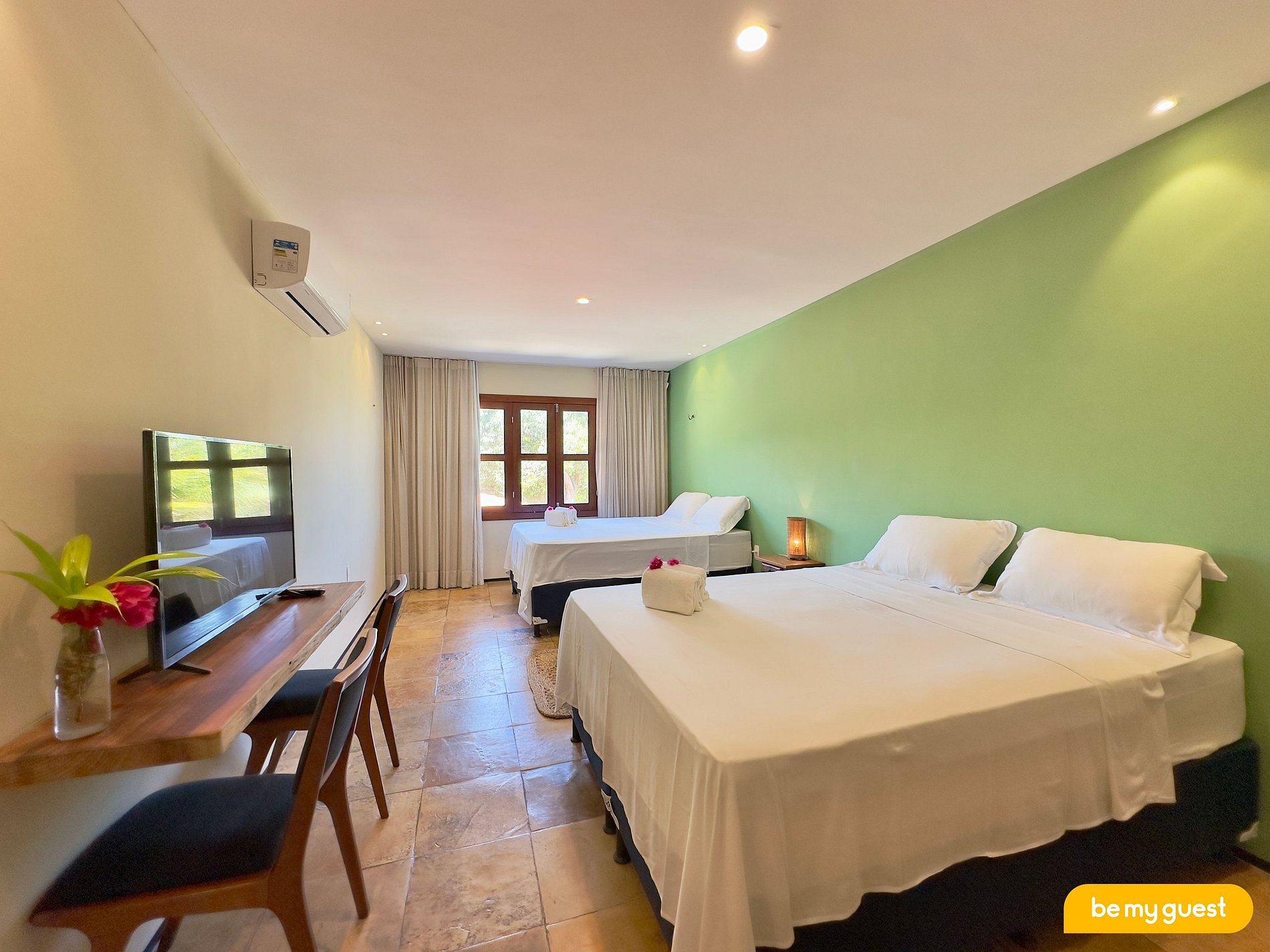 O quarto quádruplo oferece um ambiente amplo e bem organizado, ideal para estadias mais longas ou momentos de confraternização. Os hóspedes podem desfrutar de toda a estrutura da casa, incluindo piscina com vista panorâmica, jacuzzi, bangalôs para relaxar e acesso direto ao rio por meio de um píer exclusivo.