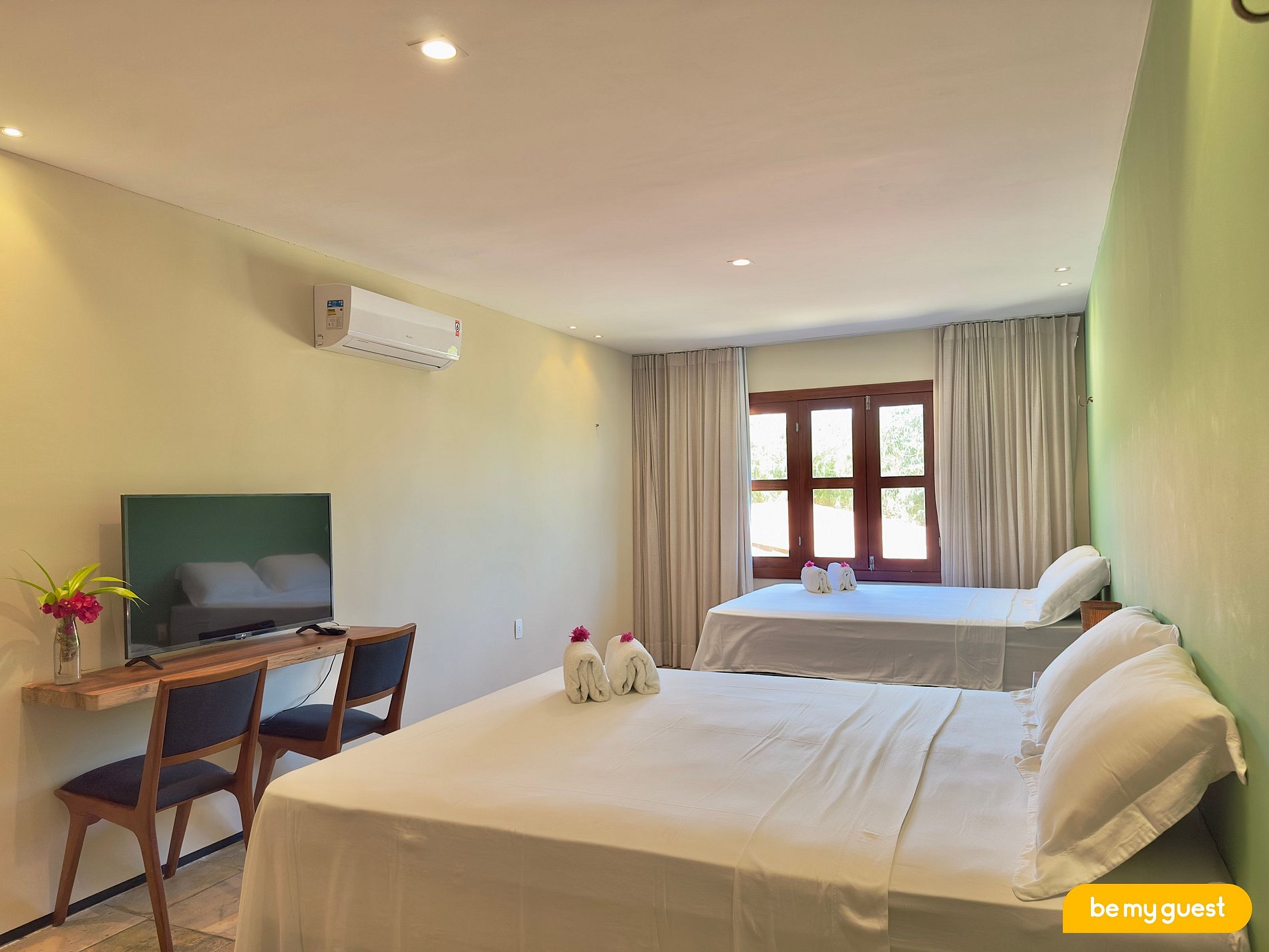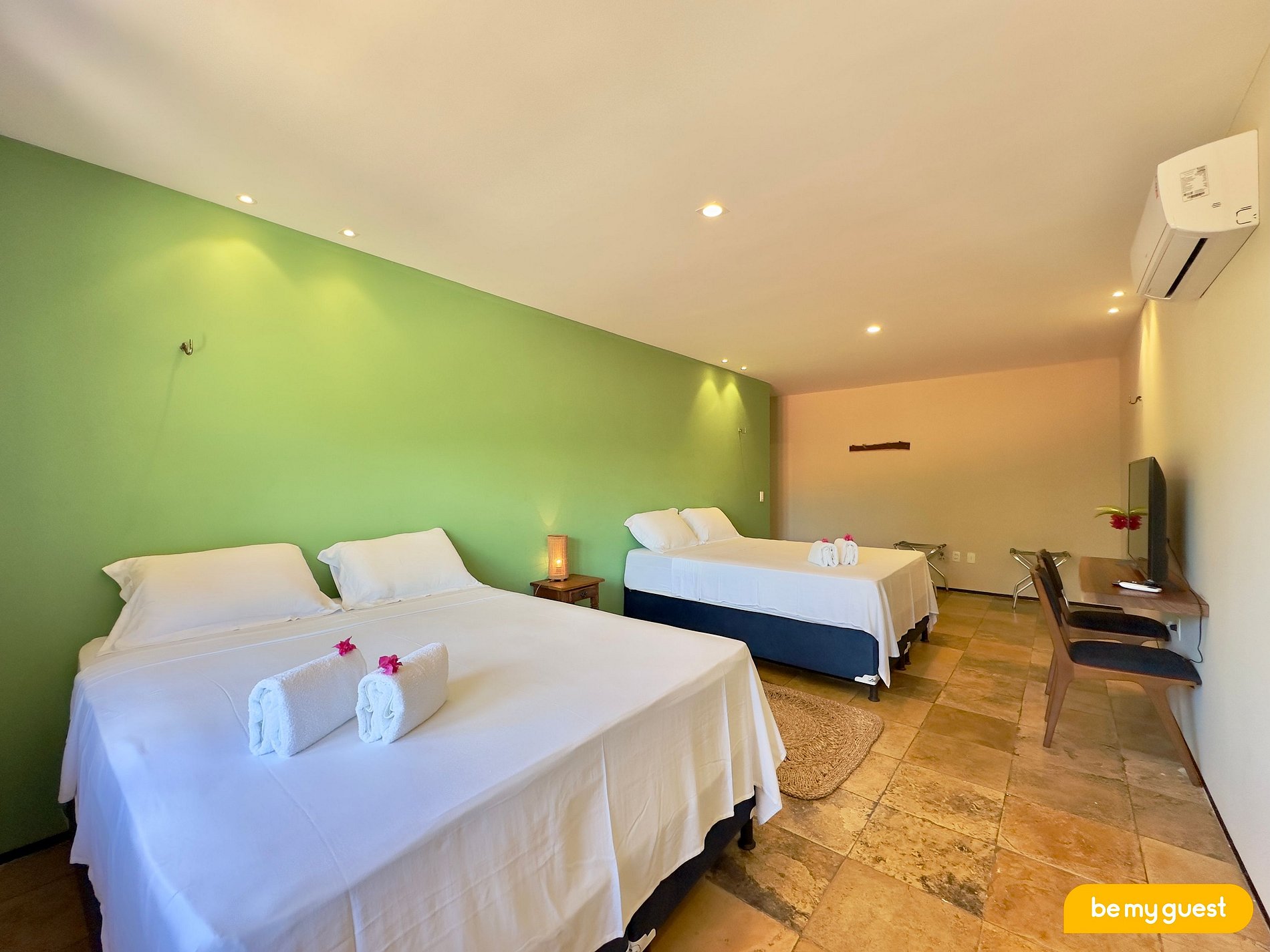 O quarto quádruplo oferece um ambiente amplo e bem organizado, ideal para estadias mais longas ou momentos de confraternização. Os hóspedes podem desfrutar de toda a estrutura da casa, incluindo piscina com vista panorâmica, jacuzzi, bangalôs para relaxar e acesso direto ao rio por meio de um píer exclusivo.