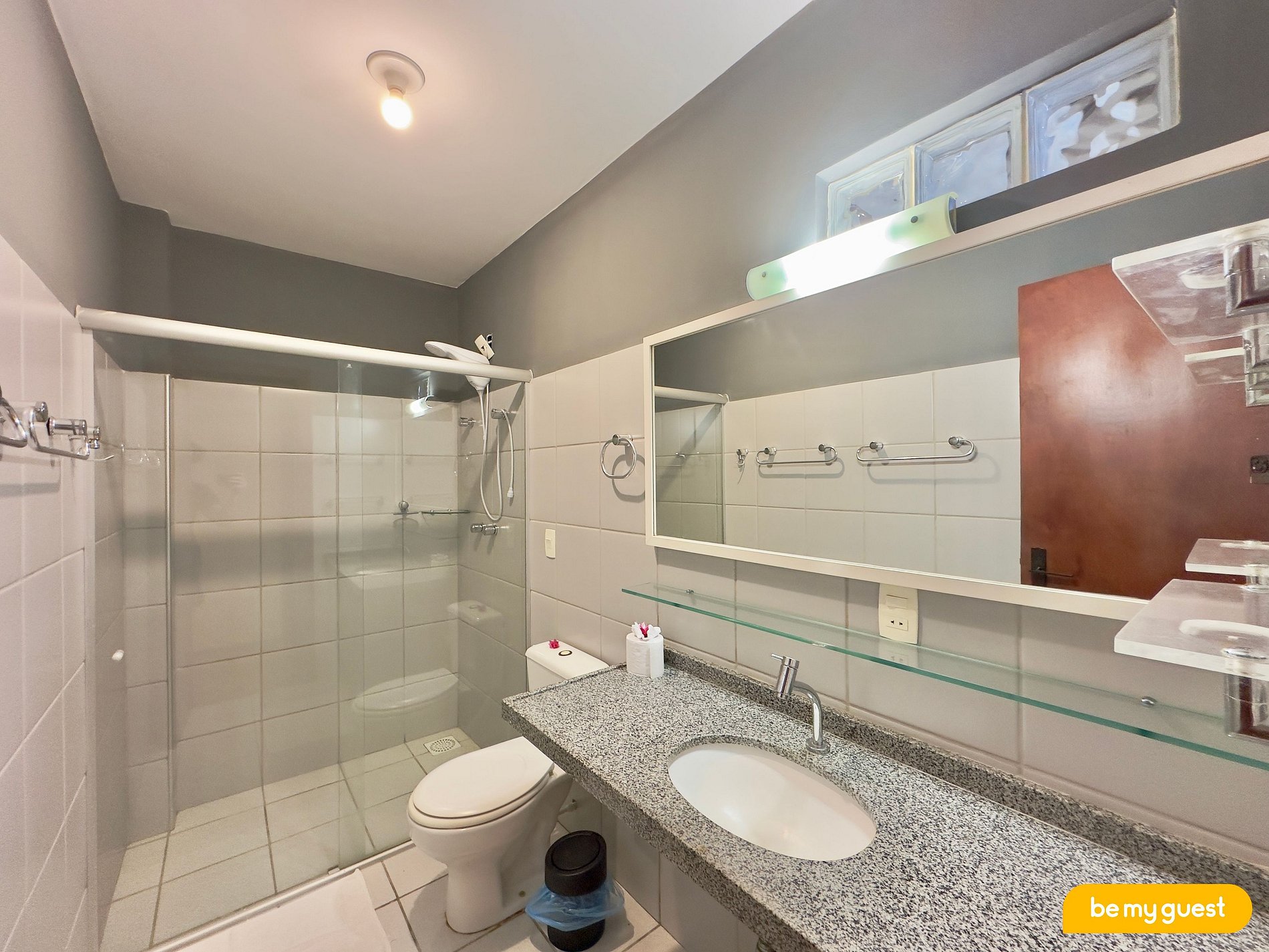 Cada suíte conta com Cama Casal Queen, Ar-Condicionado, TV Smart, Frigobar e Banheiro com água aquecida.