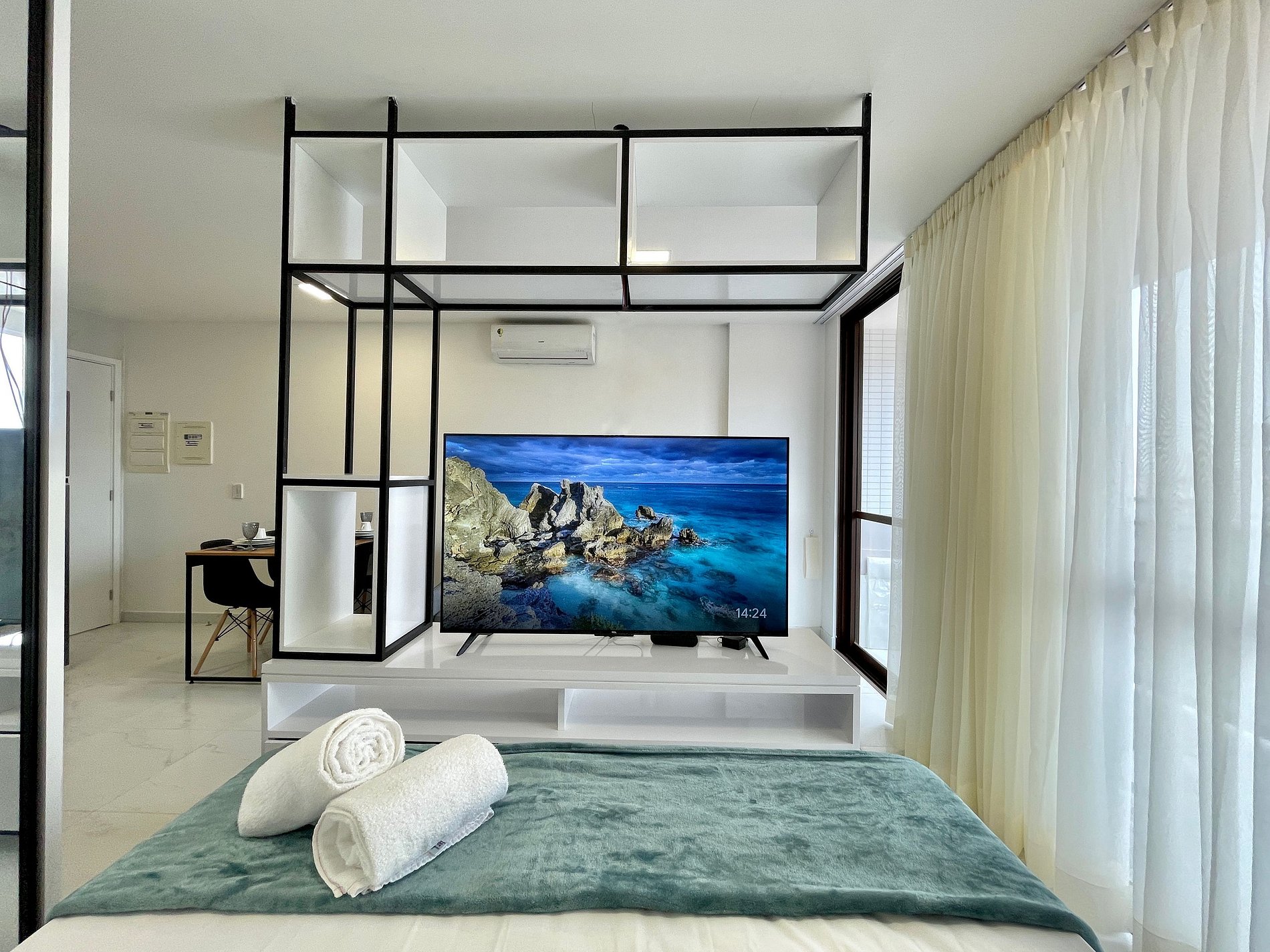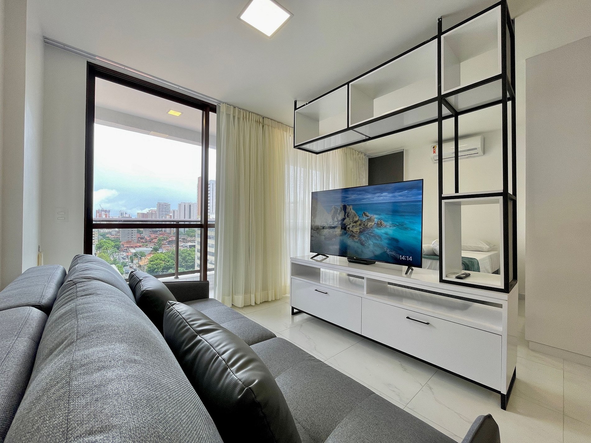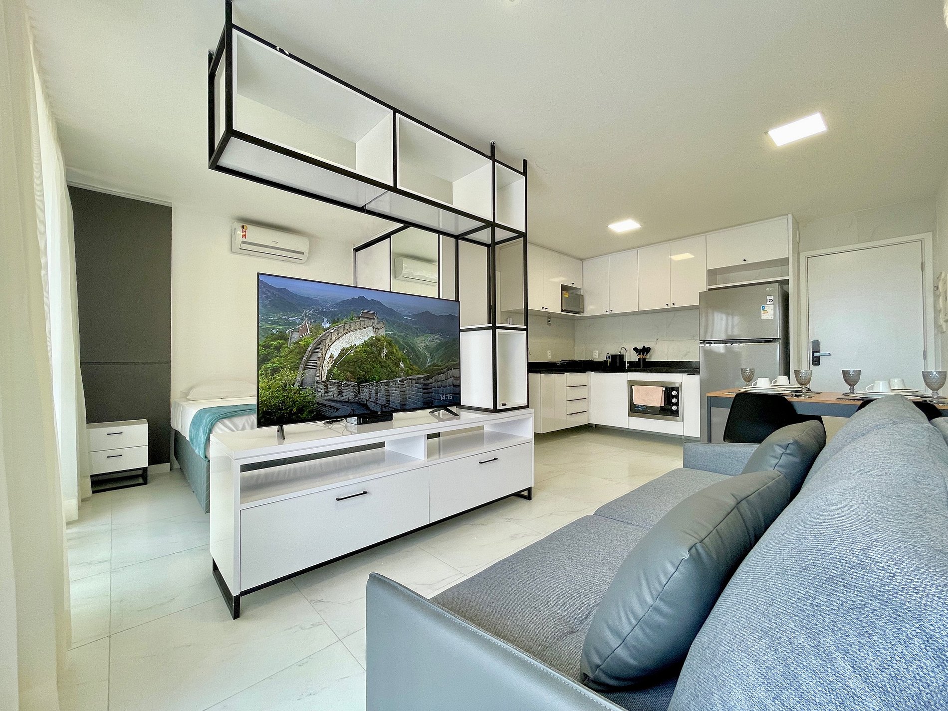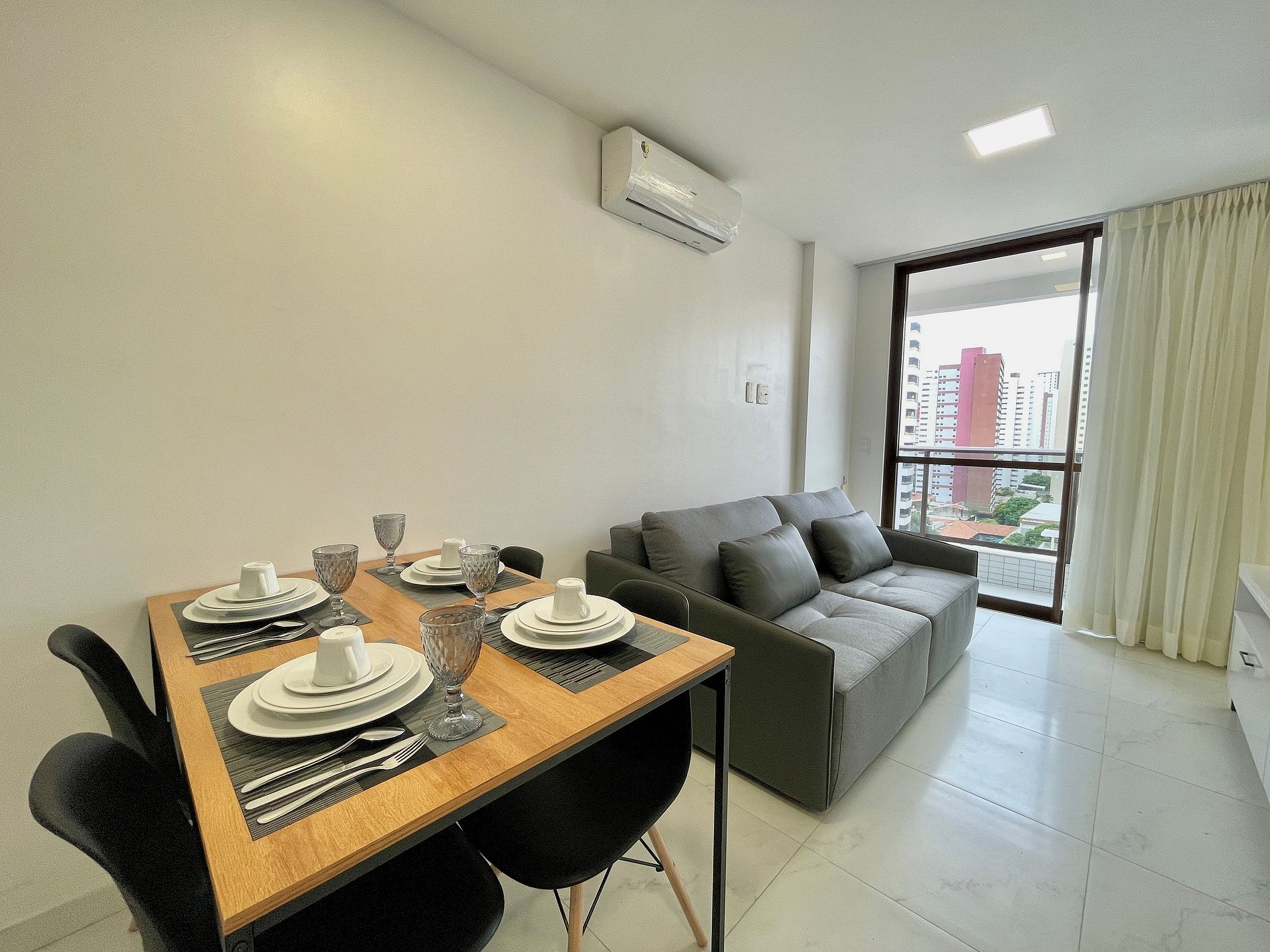 > Sala de Estar: Novíssimo Sofá-cama, mesma TV Smart 52' rotativa + Mesa de Jantar para até 4 hóspedes;