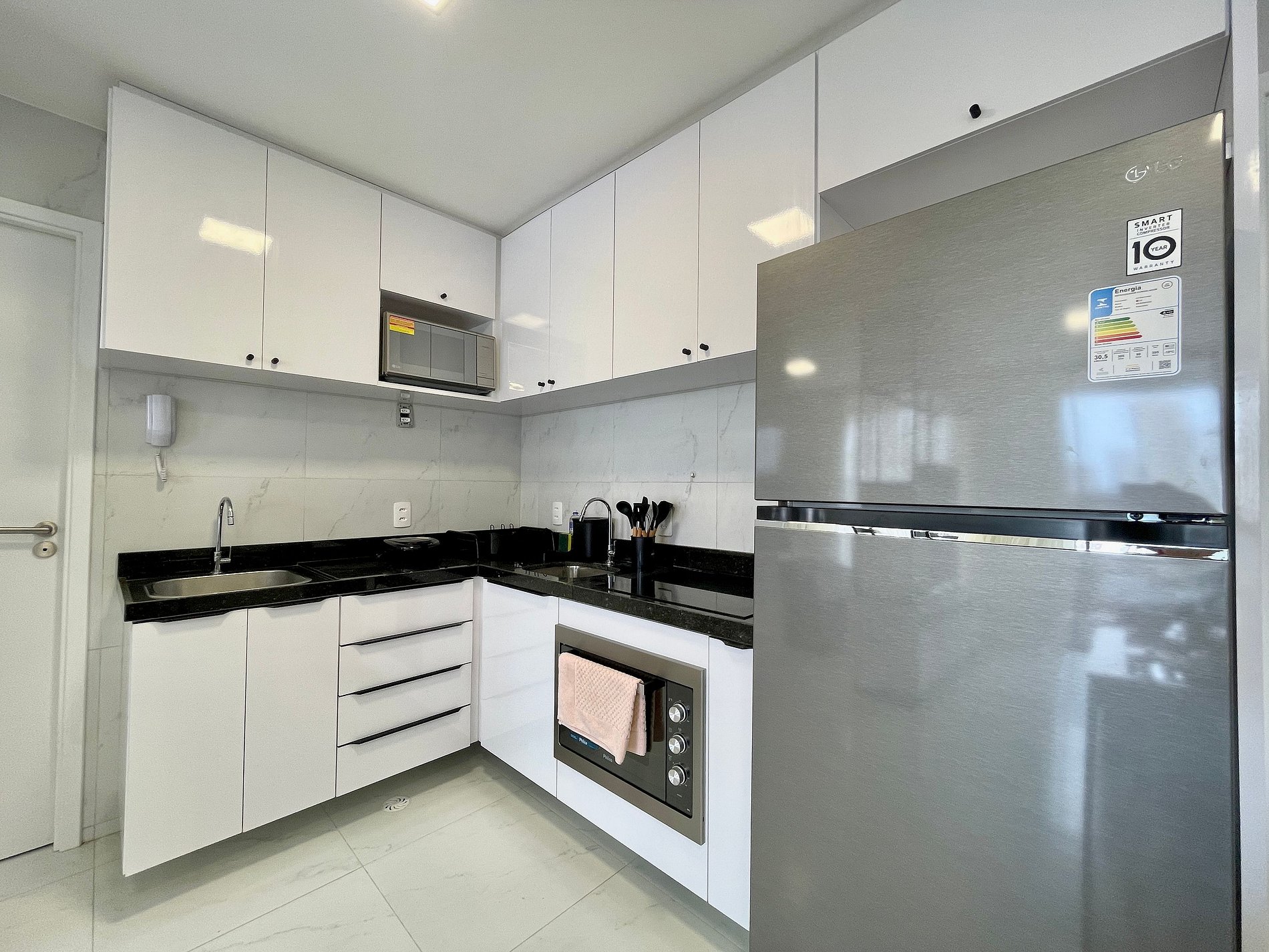 > Cozinha completa com todos os itens essenciais como Geladeira, Fogão, Microondas, Cafeteira, Liquidificador, Sanduicheira;