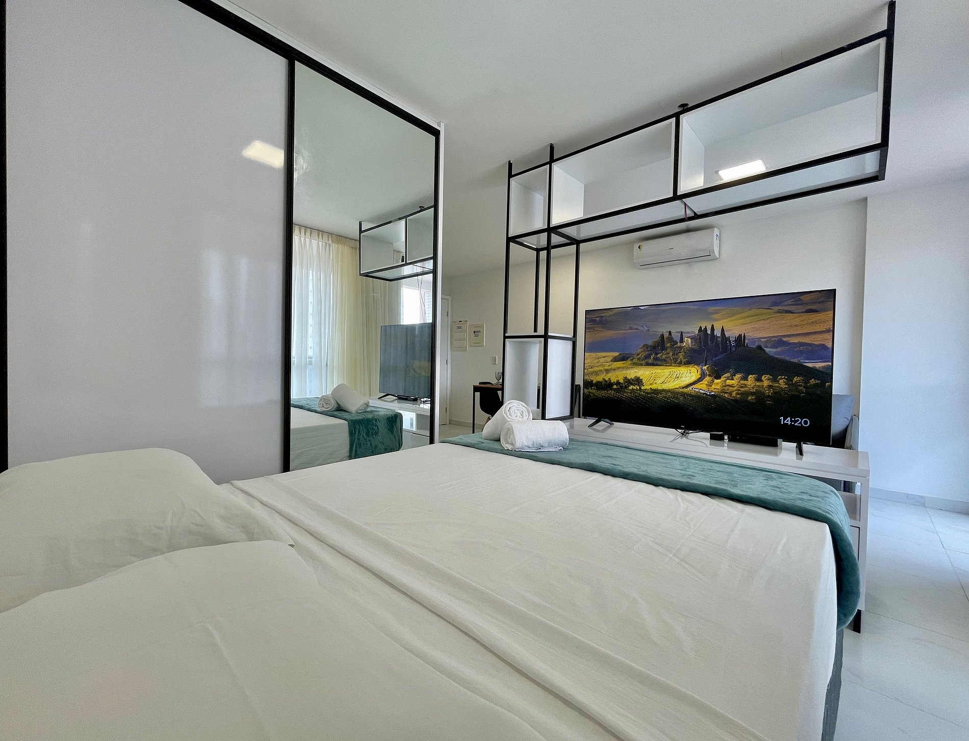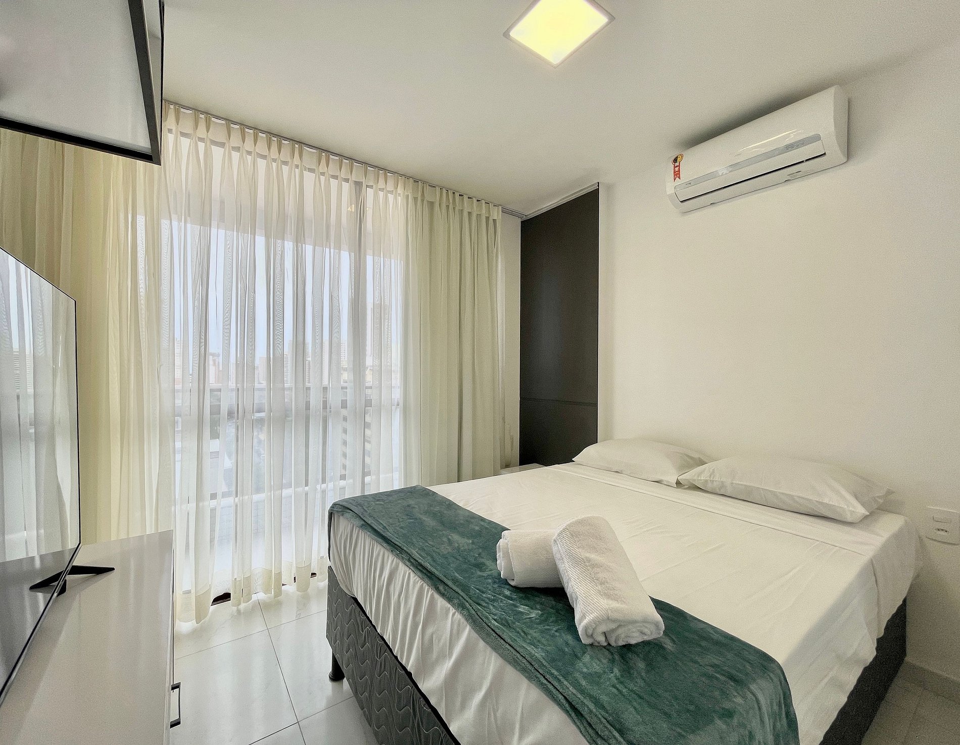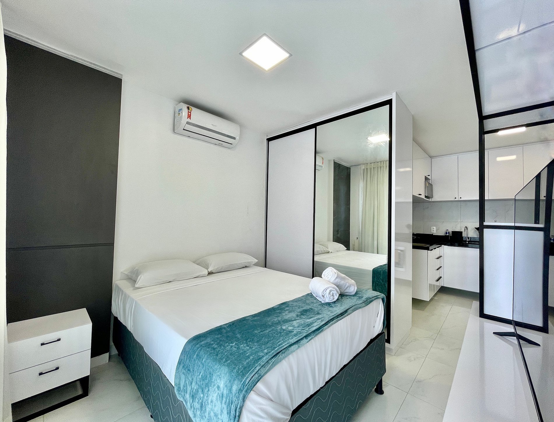 > Suíte com Cama casal e Ar Condicionado + TV Smart 52' rotativa + Armário;