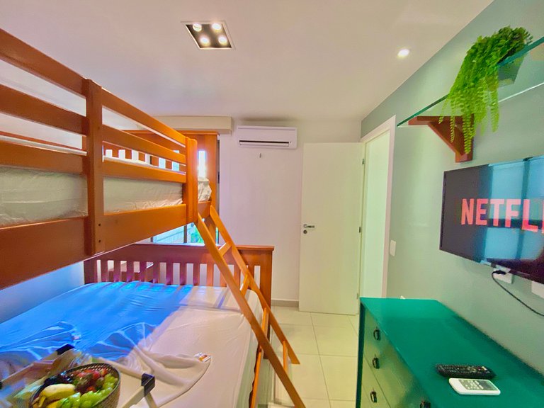 apartamento com camas confortáveis, ótimo condomínio e bem localizado. acredito que precisa de manutenção, tivemo problema ao usar o ar-condicionado da sala e a máquina de lavar.