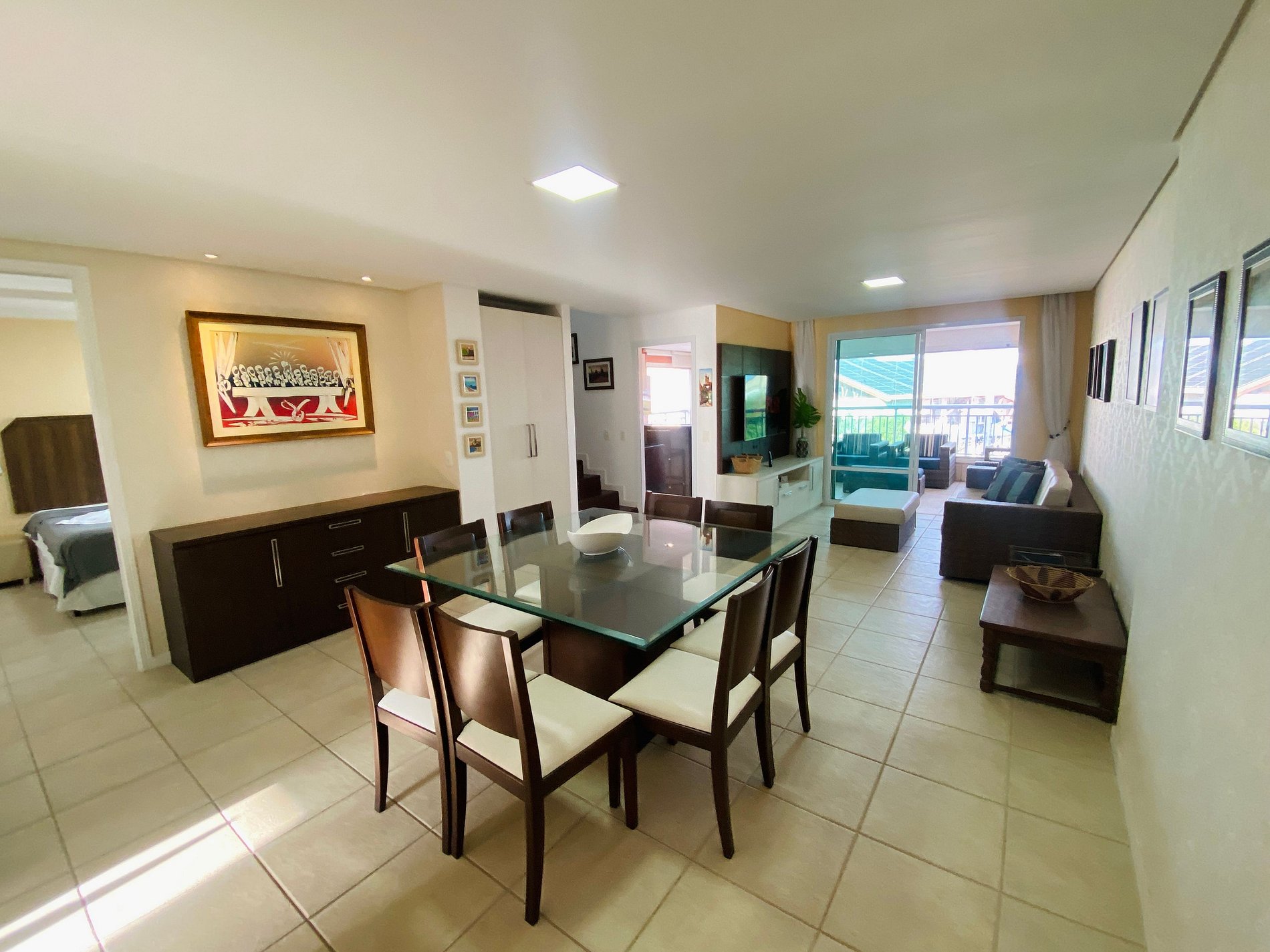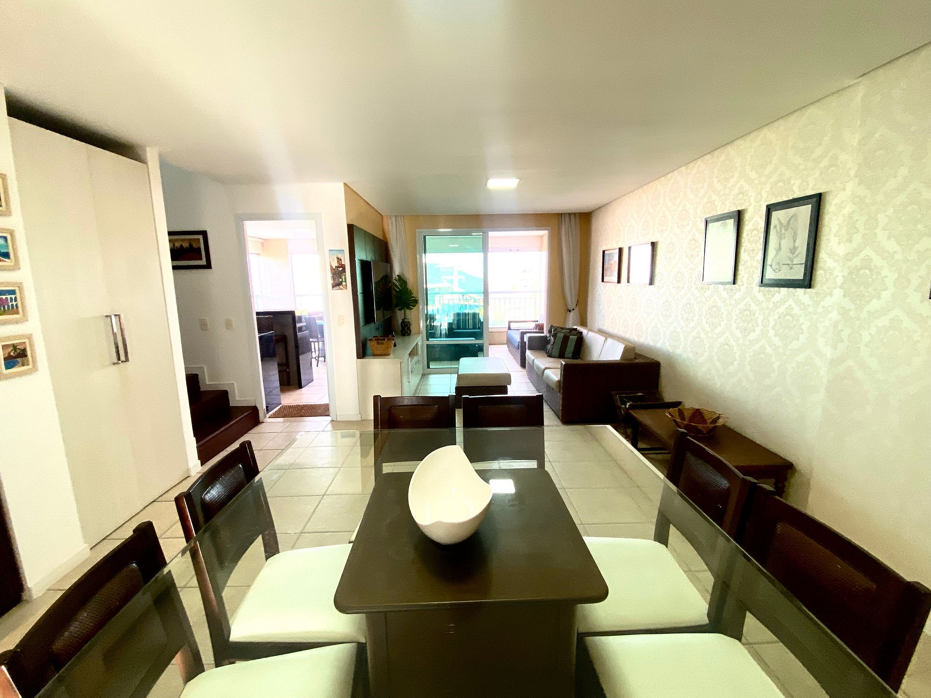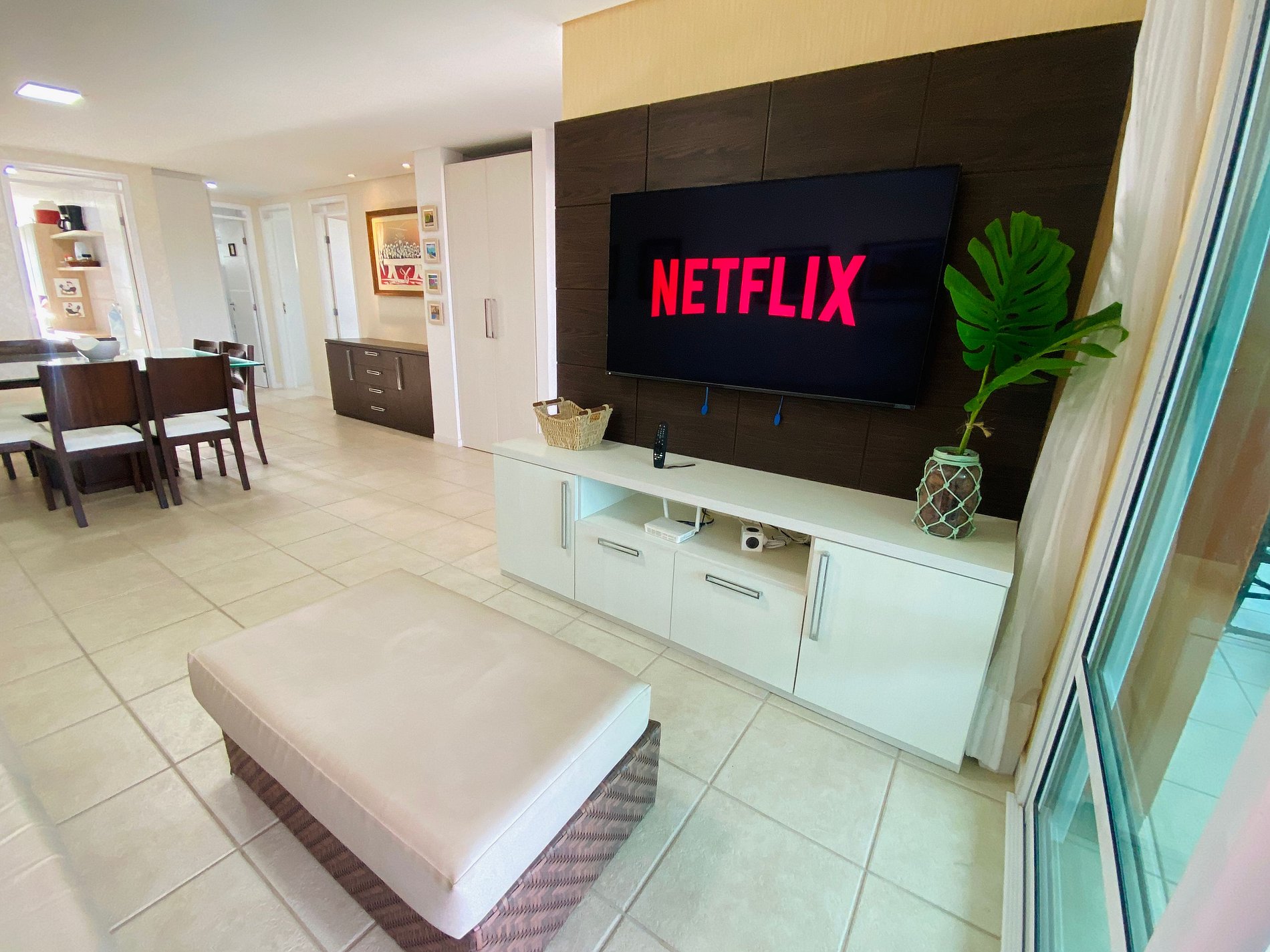 > Sala de Estar com sofá amplo e confortável + TV Smart de tela grande e Mesa de Jantar para todos.