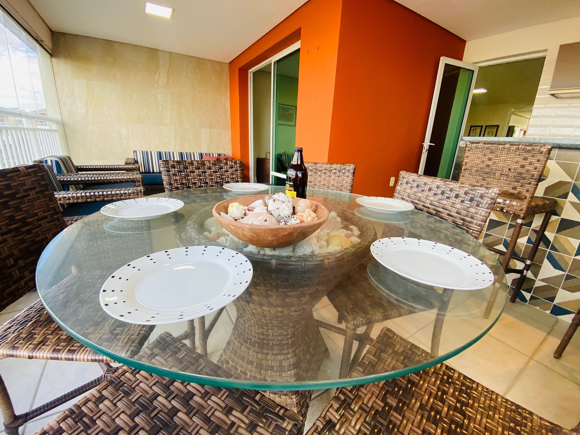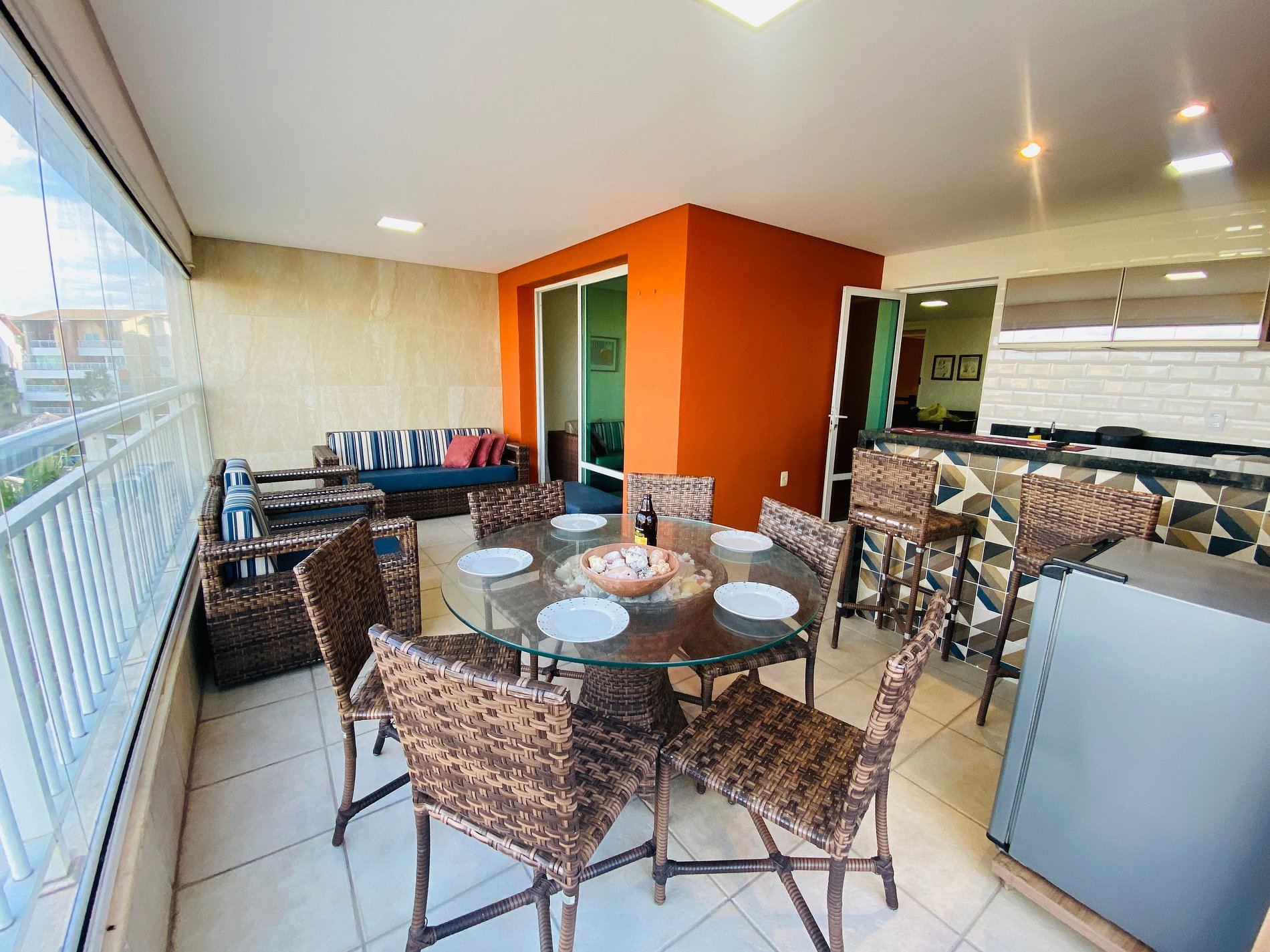 > Varanda ampla com TV Smart + Sofá + Área para Churrasco + Mesa de Jantar
