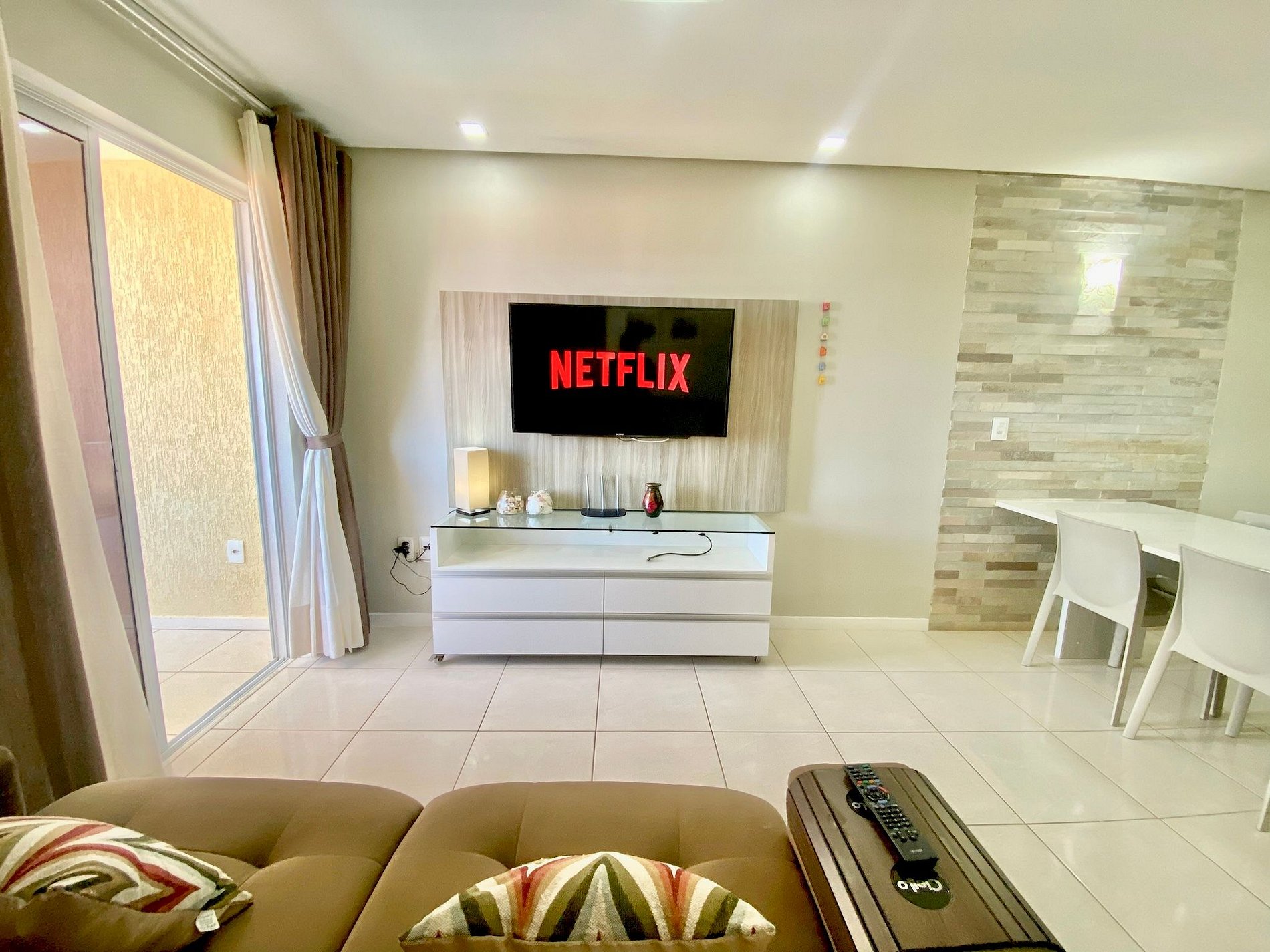 - Sala de Estar ampla com Ar Condicionado + TV Smart + Sofá ultra confortável + Espaço para Home Office e Mesa de Jantar