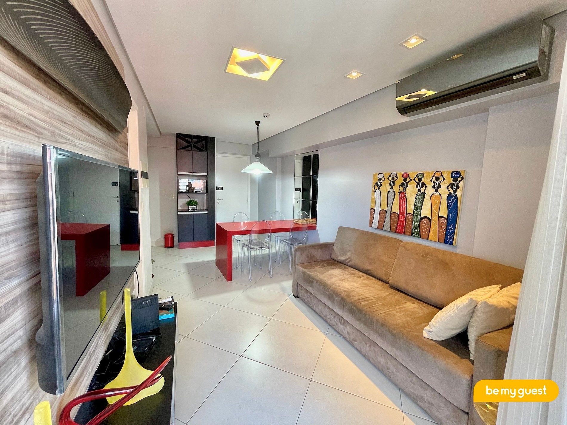 - Sala de Estar bem decorada com TV Smart e Mesa de Jantar + Ar Condicionado
