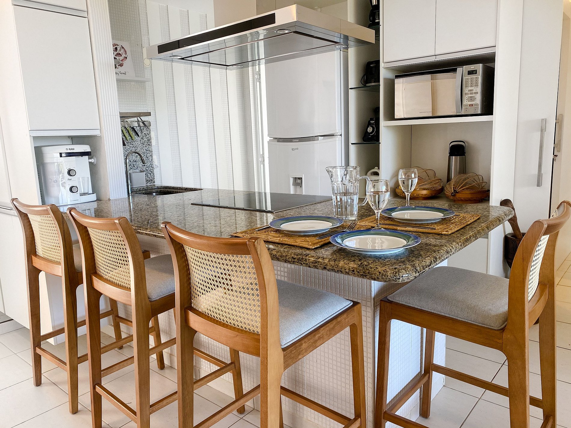 Varanda ampla com duas mesas, sala com sofá e ar condicionado, cozinha com ilha e todos utensílios.