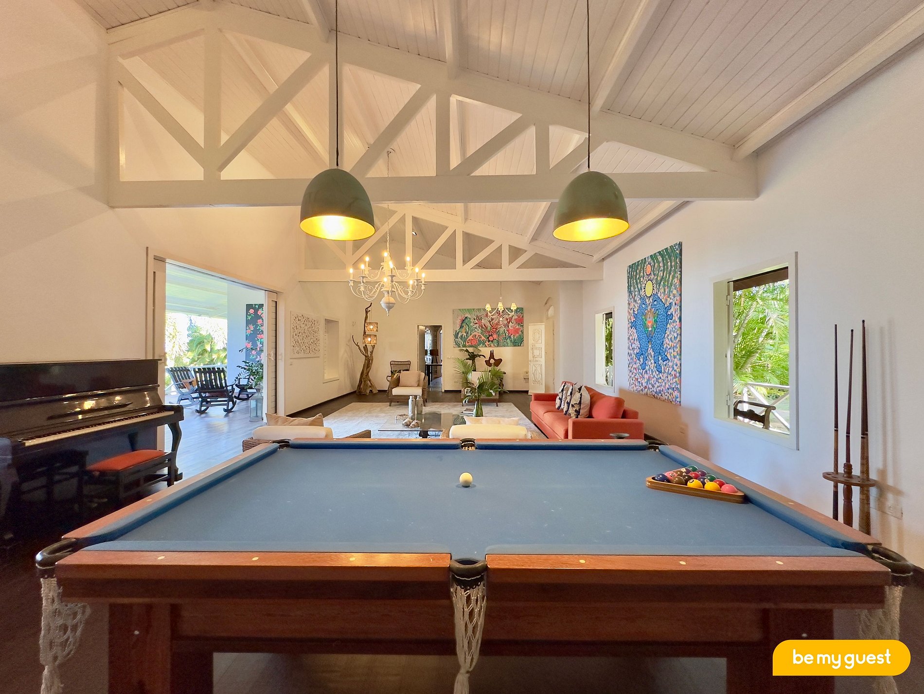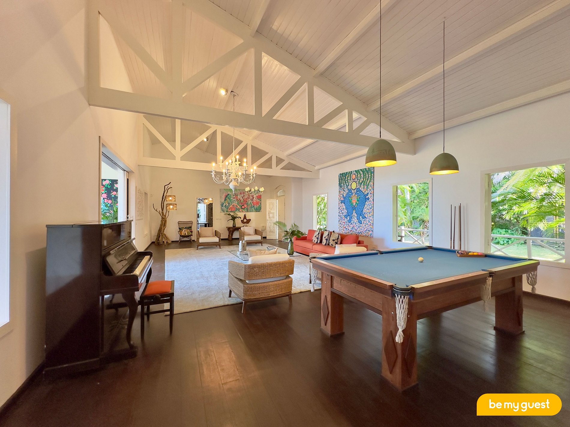 - Salão principal com sofás, poltronas, uma mesa de bilhar e piano