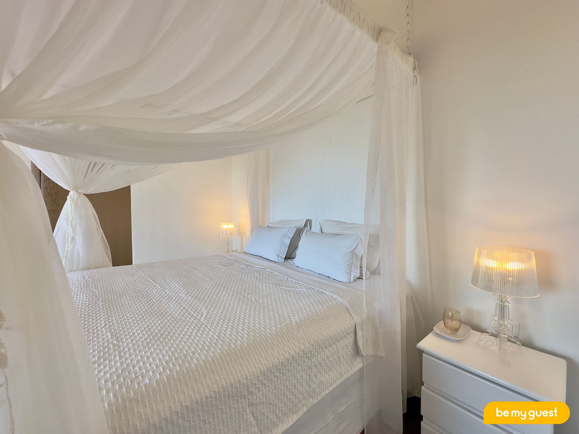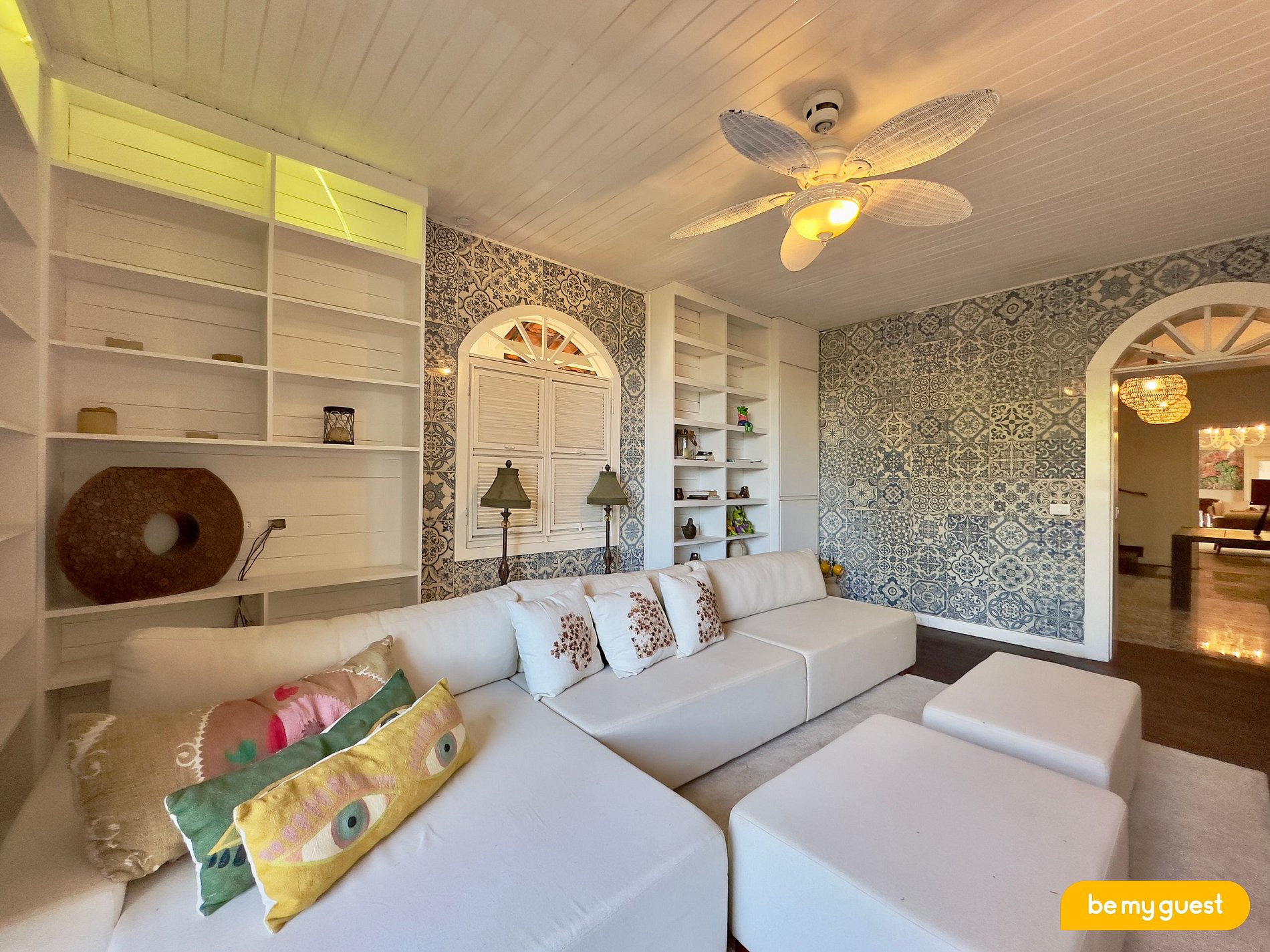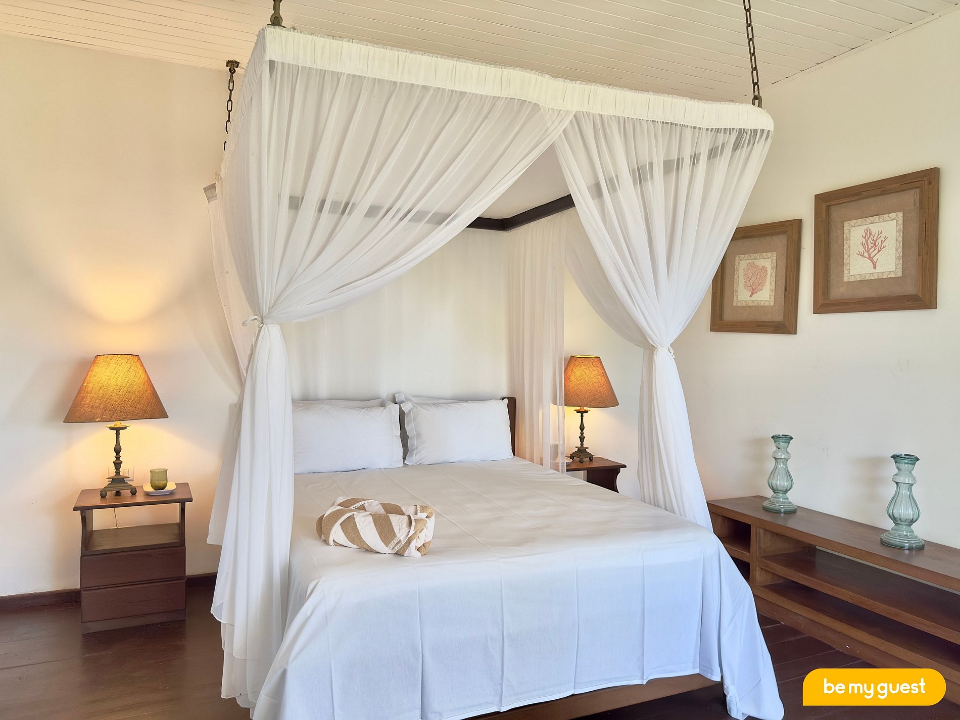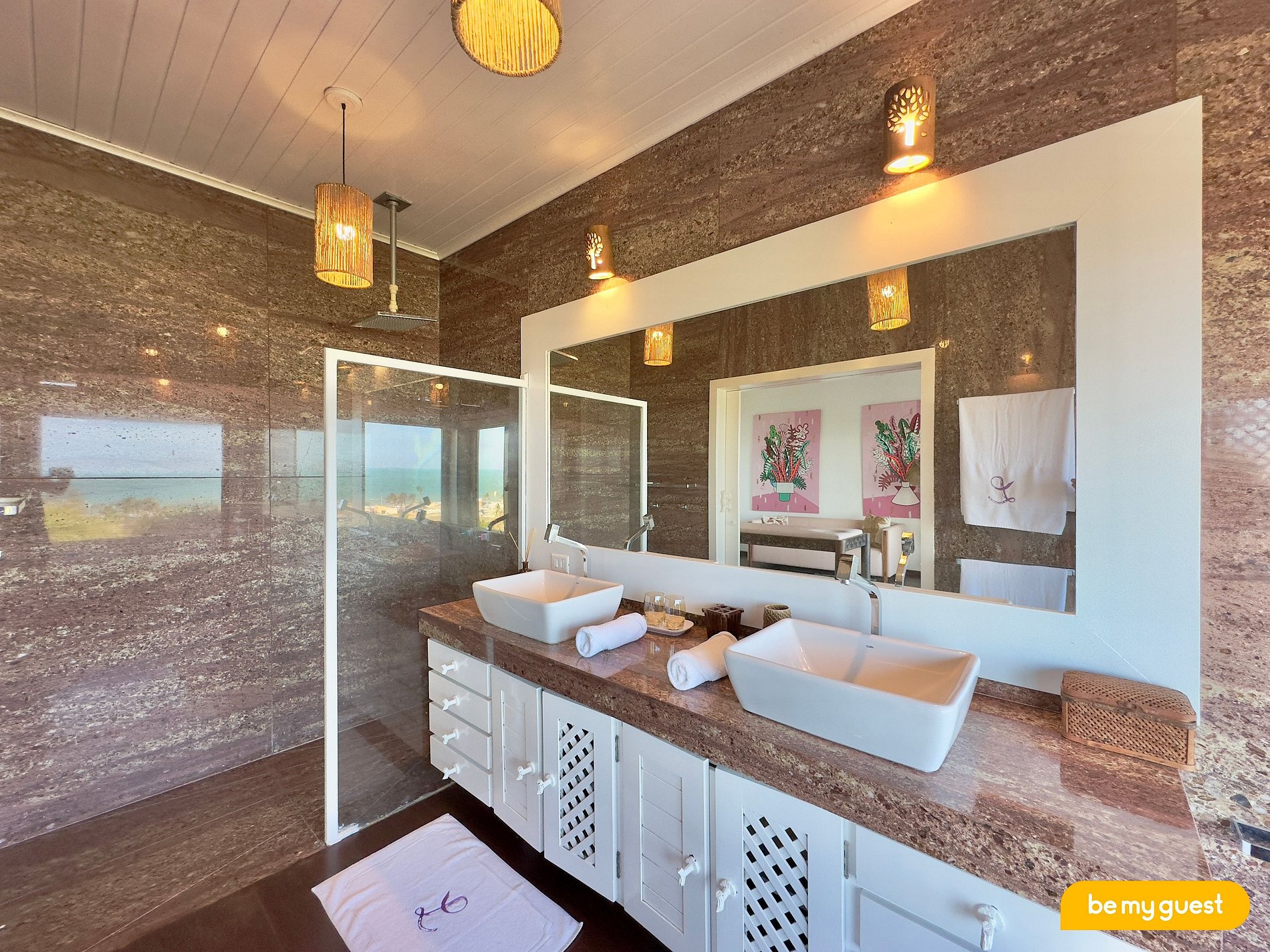 A casa dispõe de 5 suítes amplas e luxuosas, além de uma Suíte Master, que oferece um ambiente climatizado e aconchegante com vista indescritível para o oceano e quarto de banho com banheira e cadeira de massagem, para seus momentos de relaxamento.