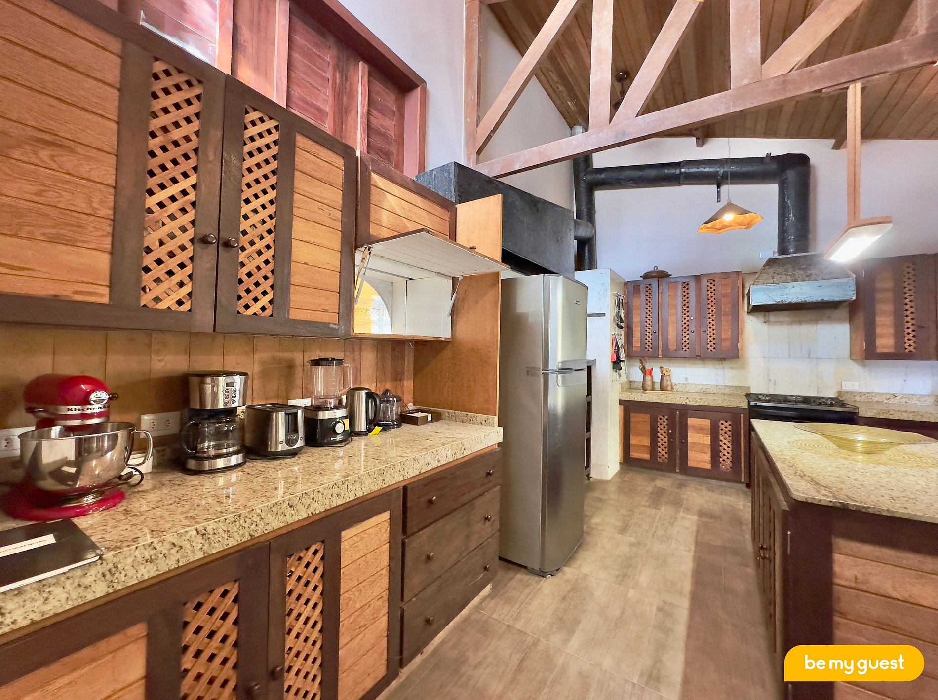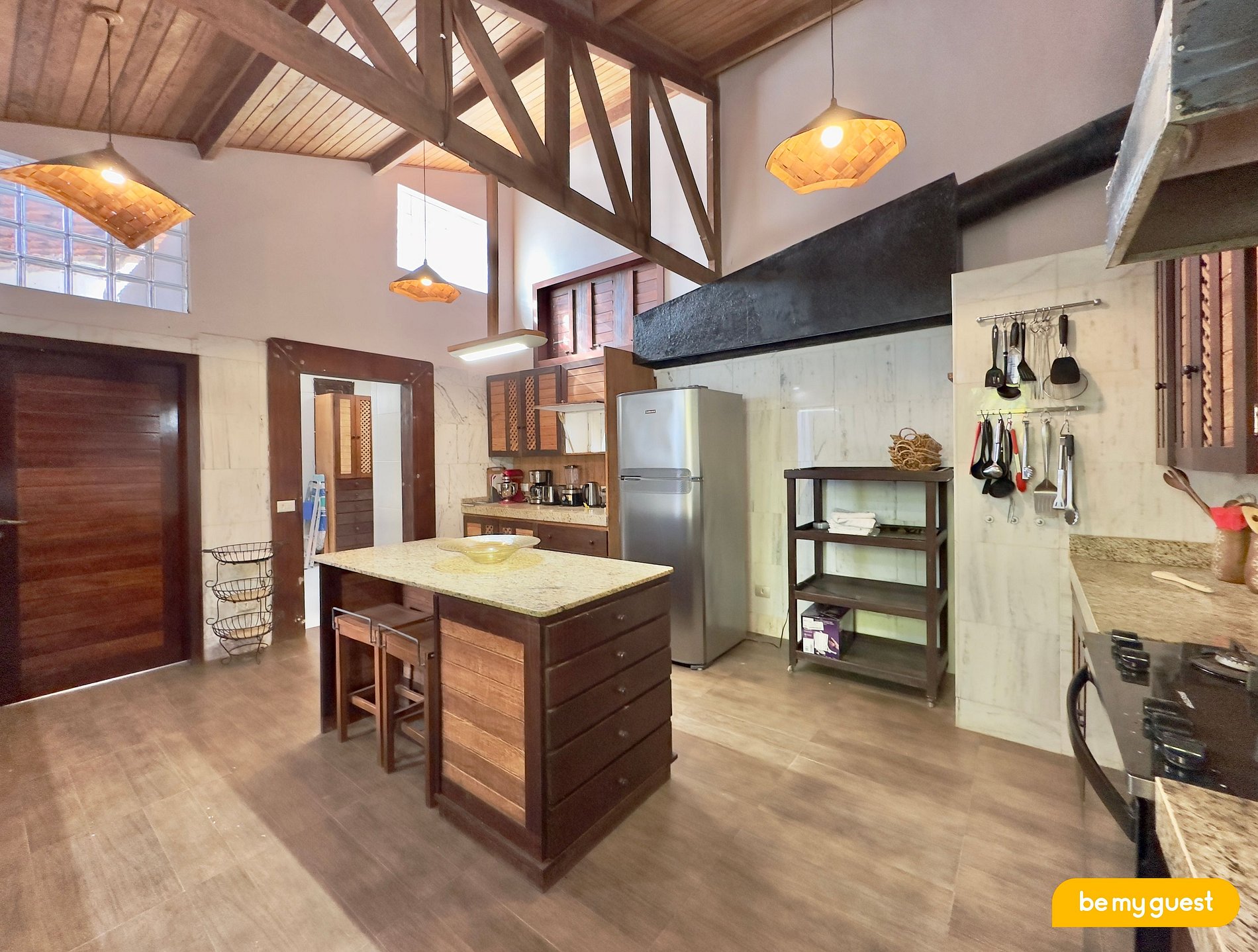 A cozinha é grande, moderna, totalmente equipada. Que tal viver a experiência de ter um chef particular e um cardápio personalizado para seu café da manhã, almoço e jantar, neste espaço?