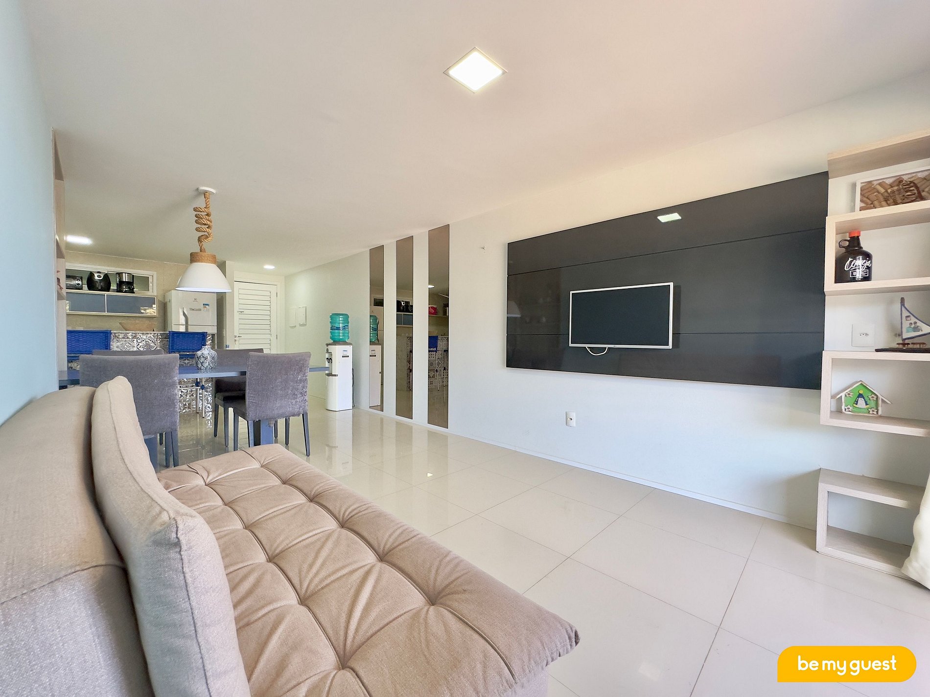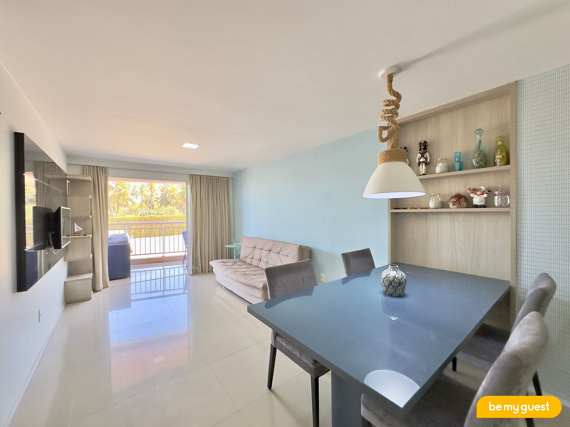 > Sala de Estar com TV Smart, mesa de jantar e sofá-cama