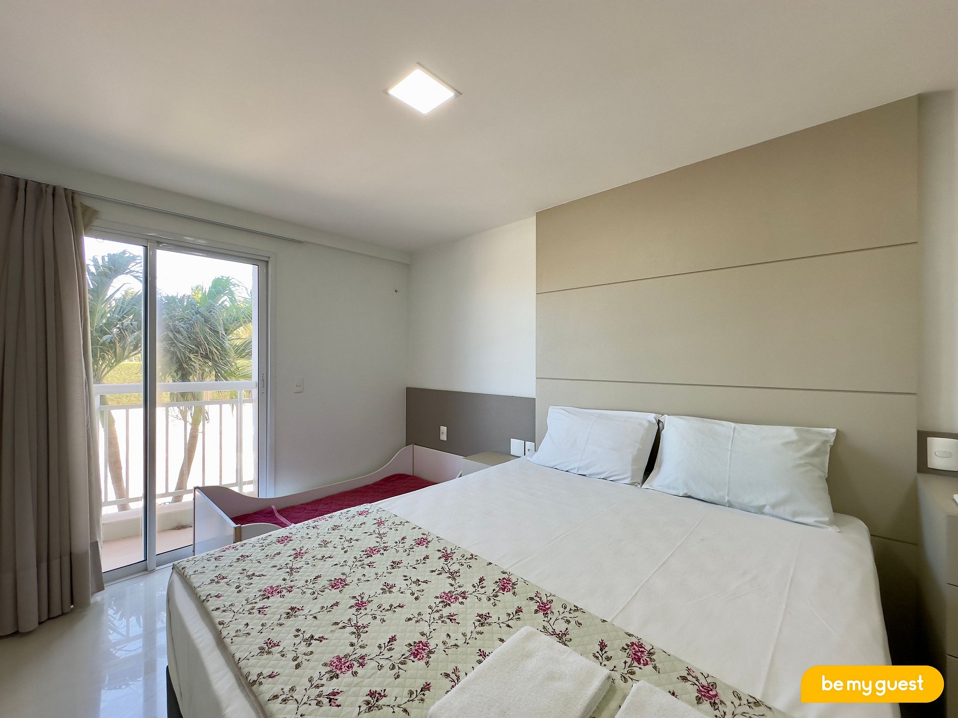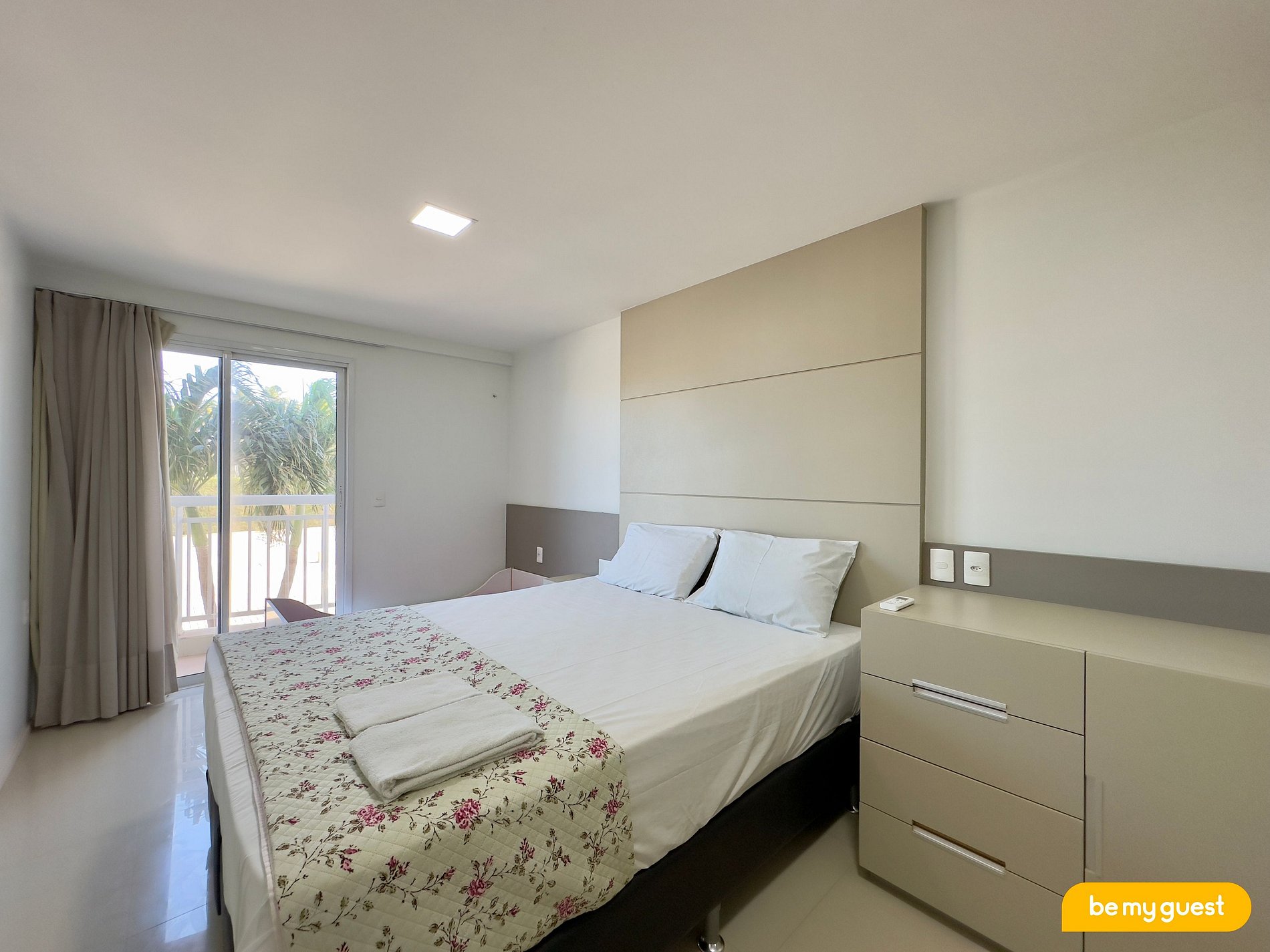 > Suíte principal com cama Queen, conectada a varanda e ar condicionado
