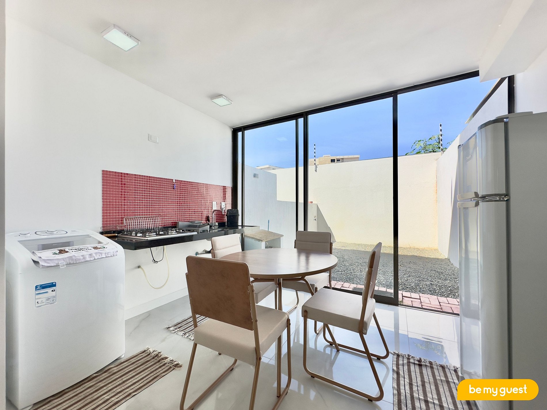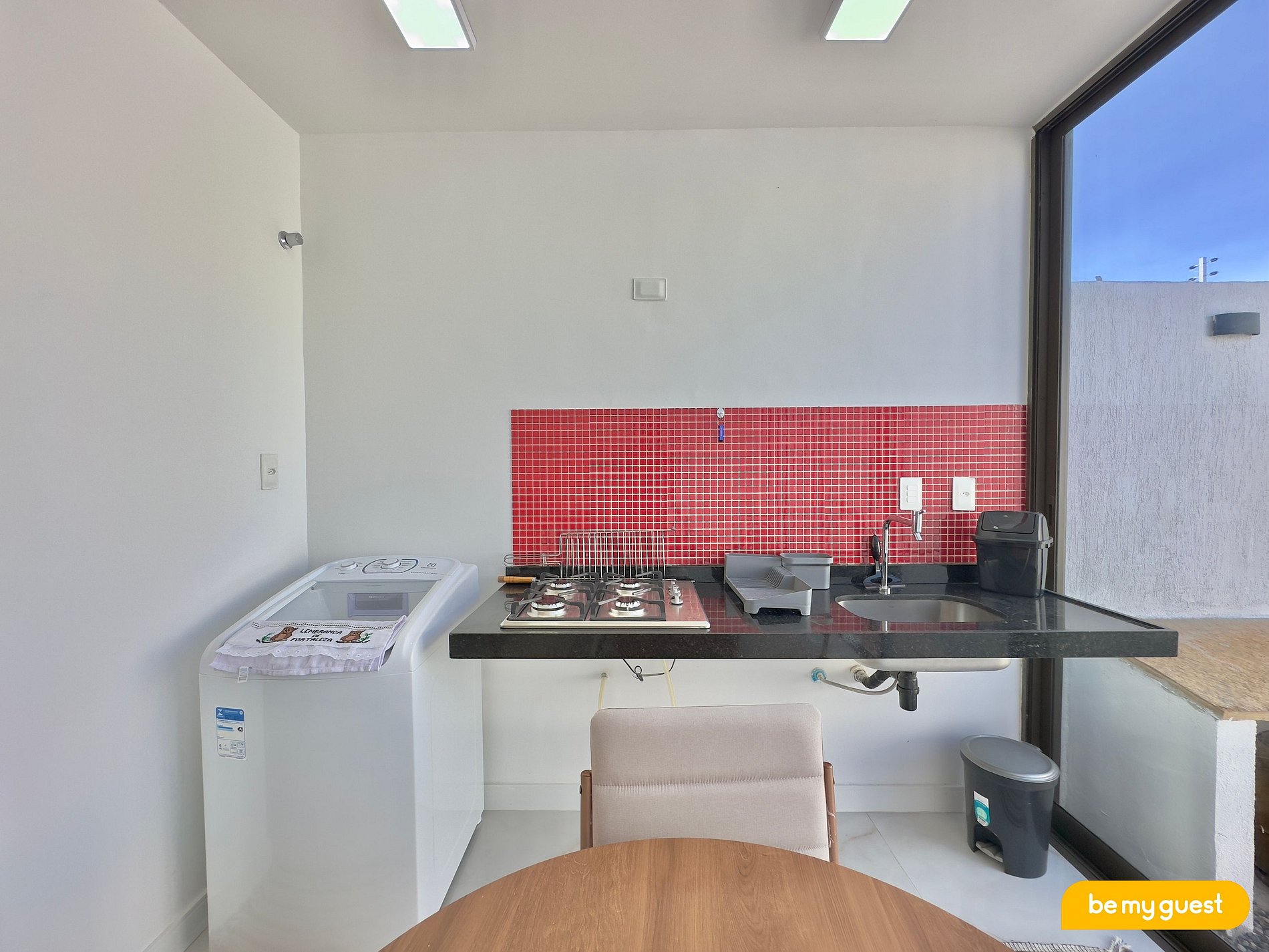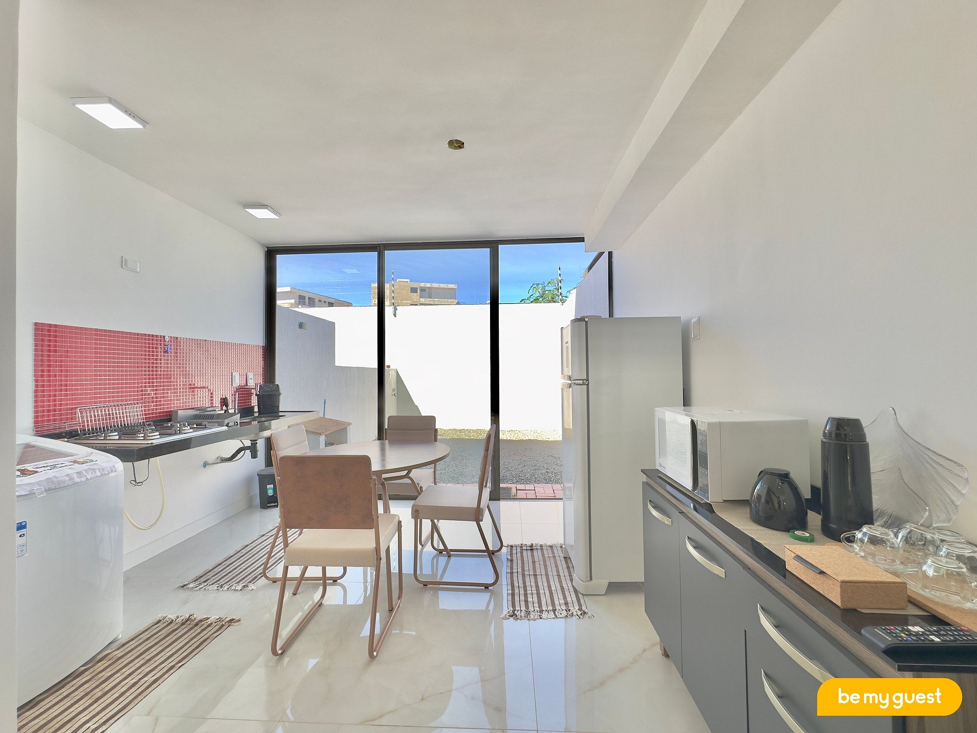 - Cozinha compacta com eletrodomésticos essenciais e mesa de jantar