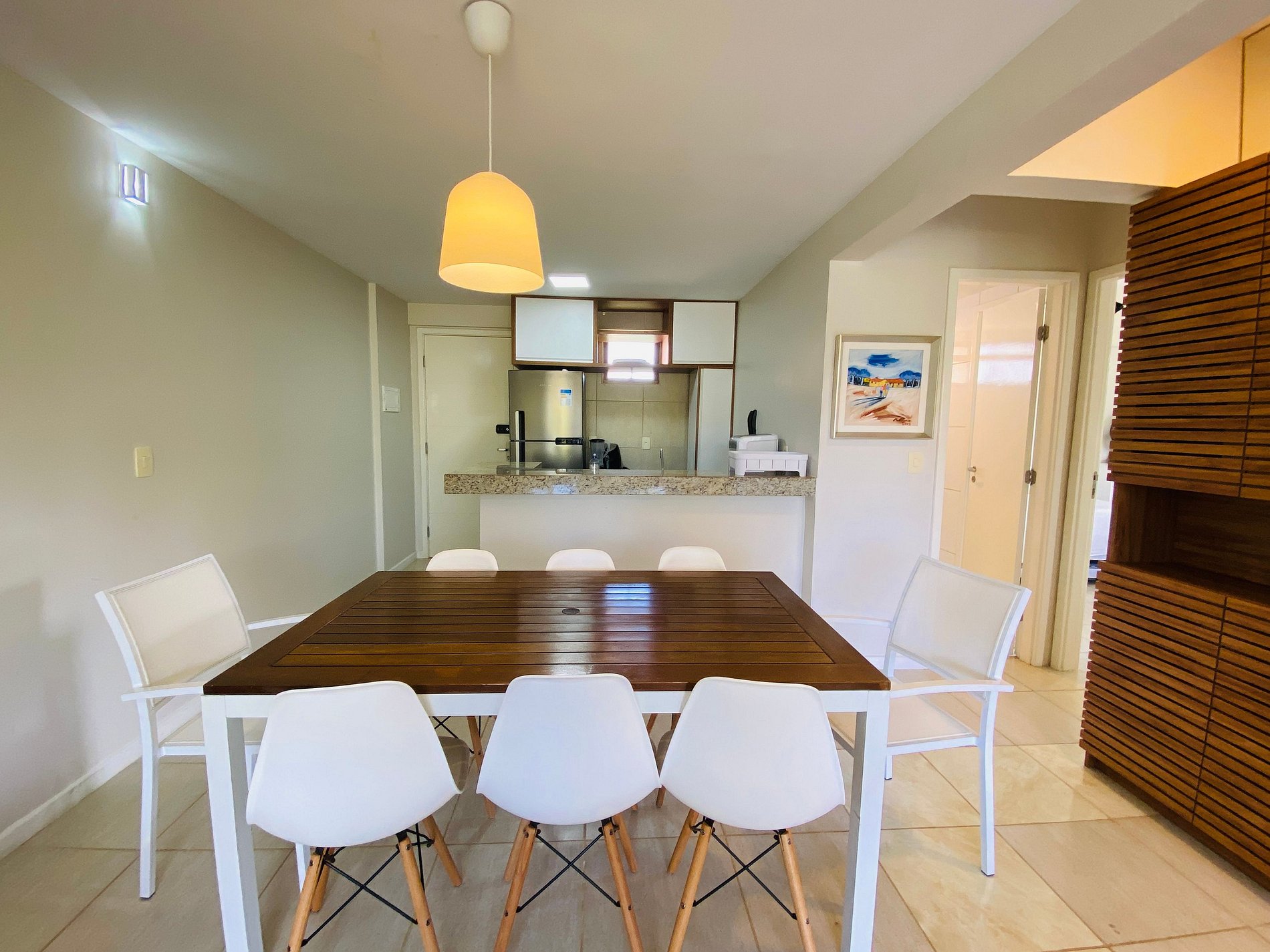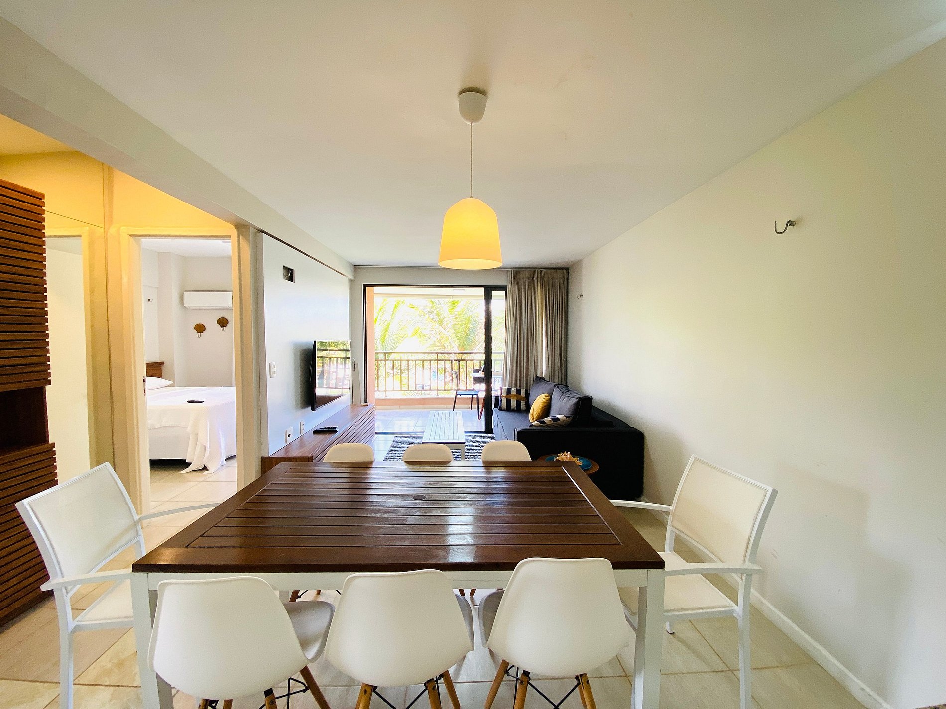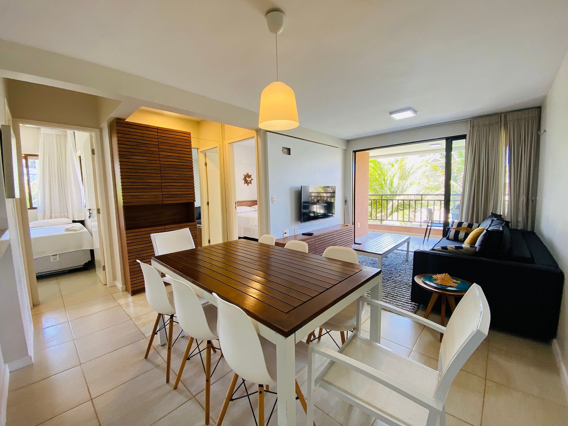 O apartamento comporta seis pessoas. Composto por uma suíte com cama Queen e um quarto com duas beliches. Uma sala de estar espaçosa com Tv e um sofá confortável. Uma varanda ideal para convivência. Uma cozinha compacta equipada com tudo que você pode chegar a precisar.