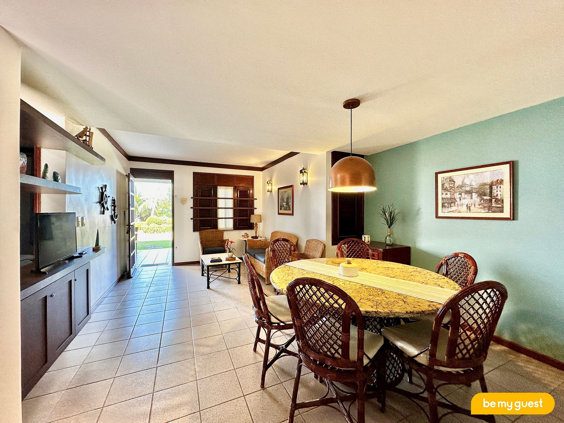 - Sala de Estar ampla com sofá, mesa de jantar e TV Smart