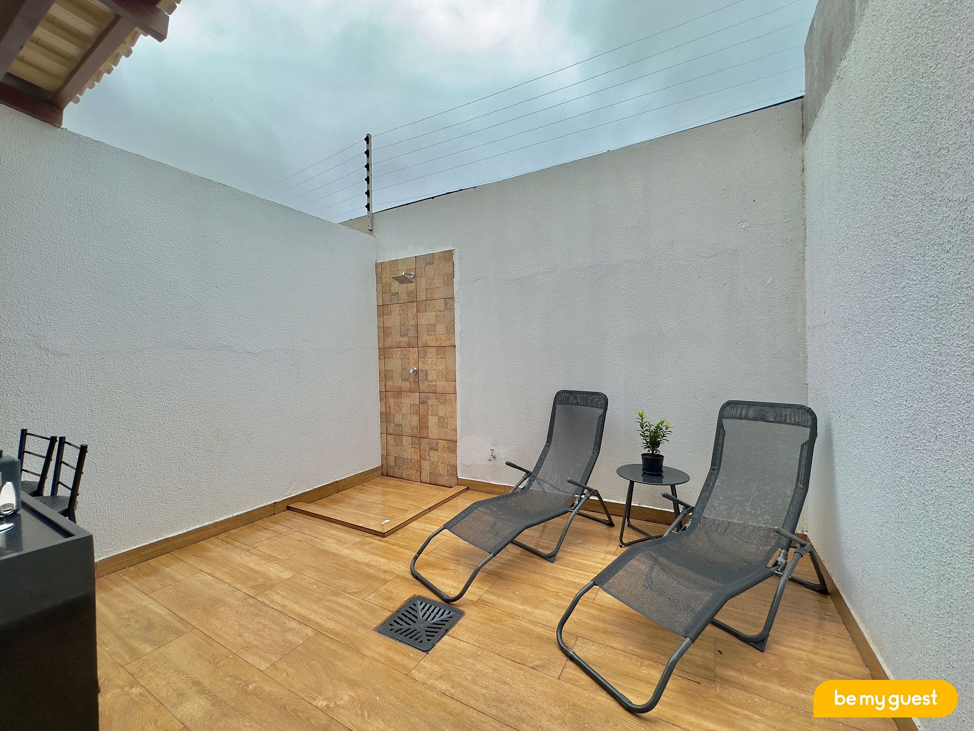 - Varanda planejada com churrasqueira, espreguiçadeira e chuveiro externo