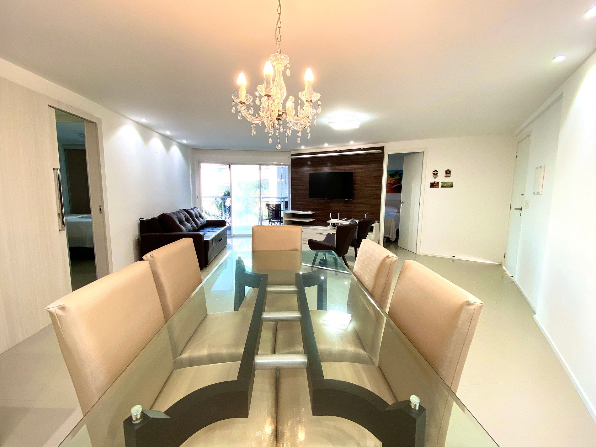O apartamento é lindo! São três quartos com banheiro. Sala ampla, ótimo espaço e muito arejado. Condomínio maravilhoso com tres piscinas imensas. Inclusive usamos a piscina à noite. Muito perto do Beach park. Estávamos em cinco adultos e foi maravilhoso.
