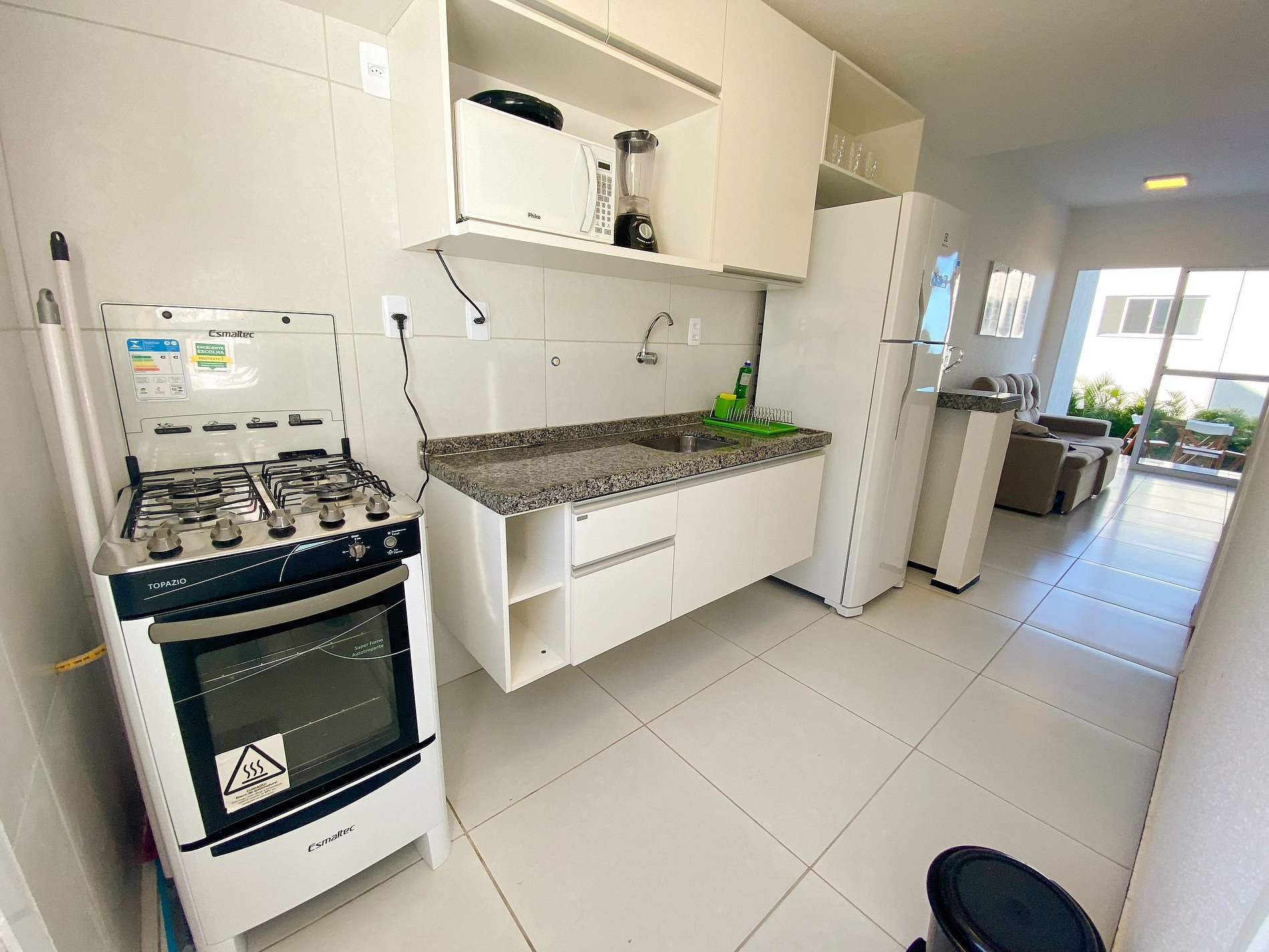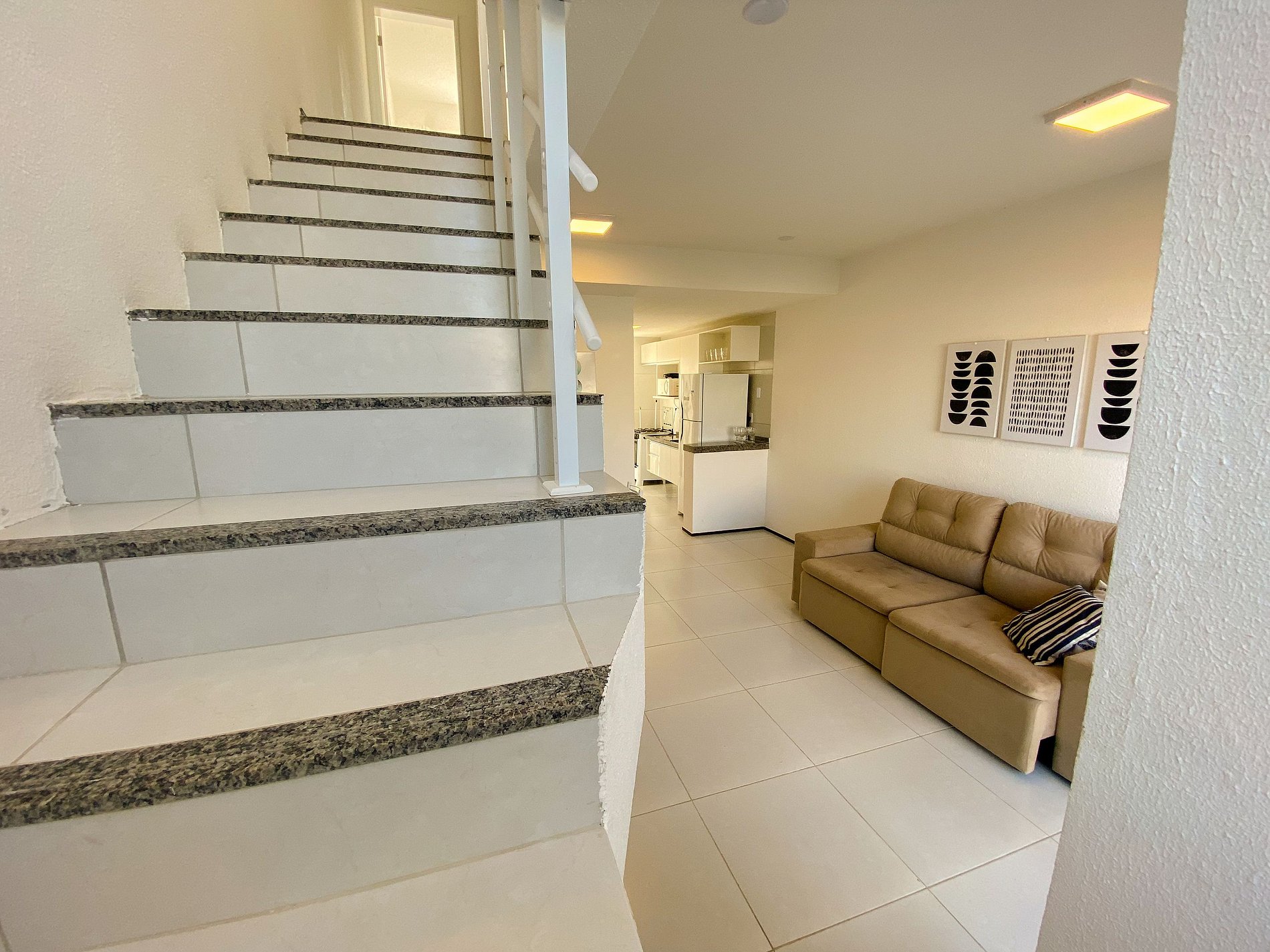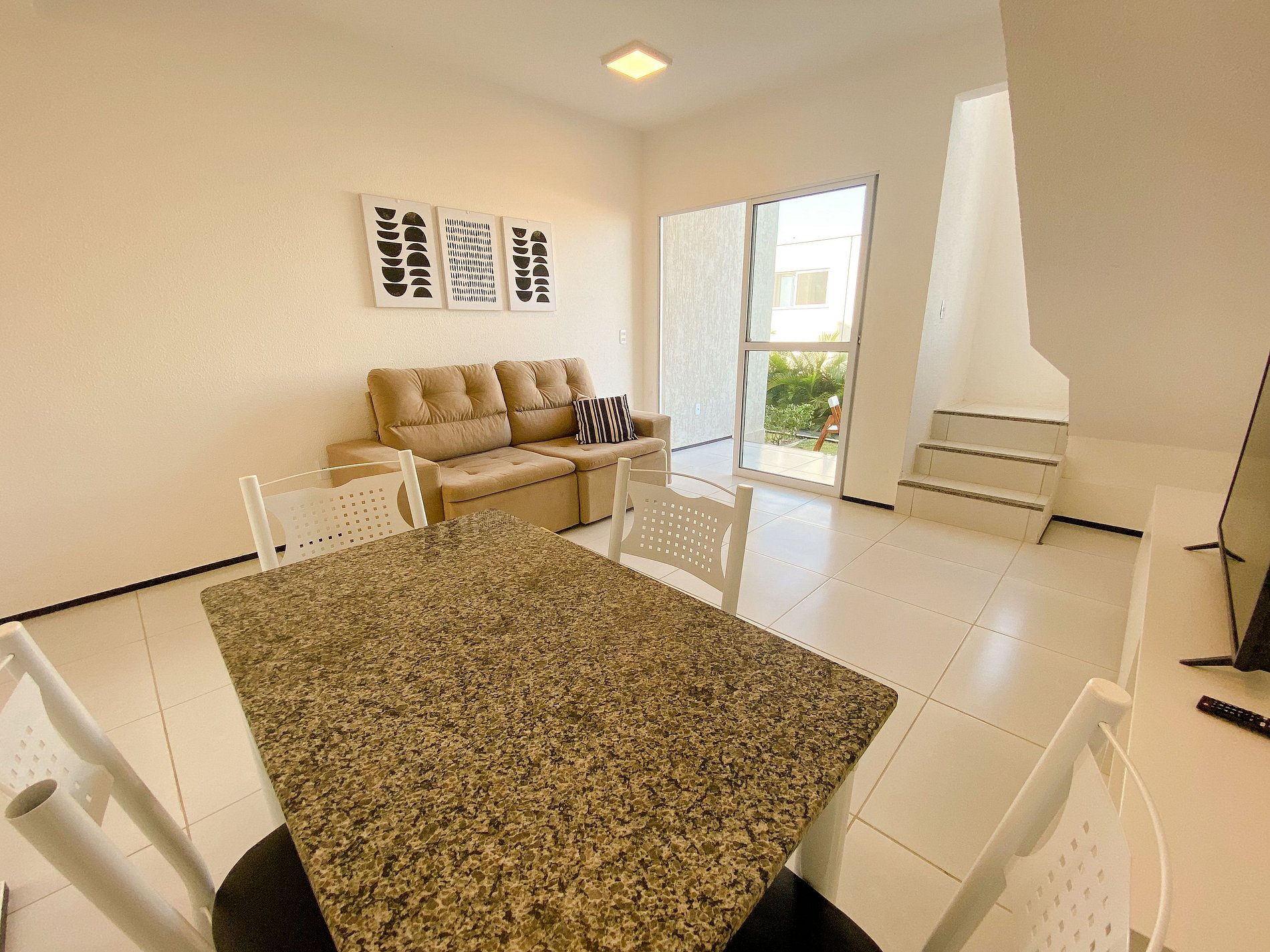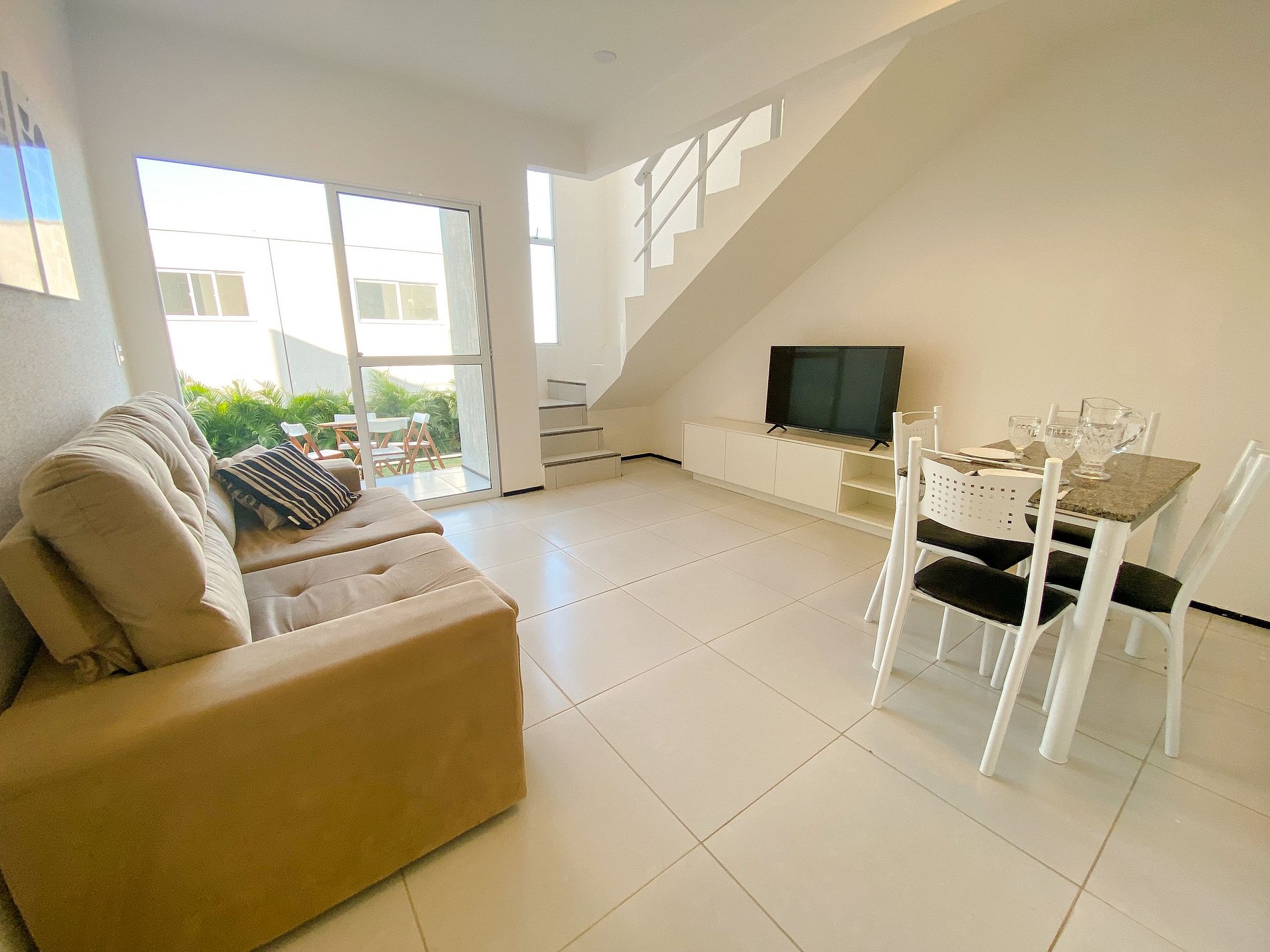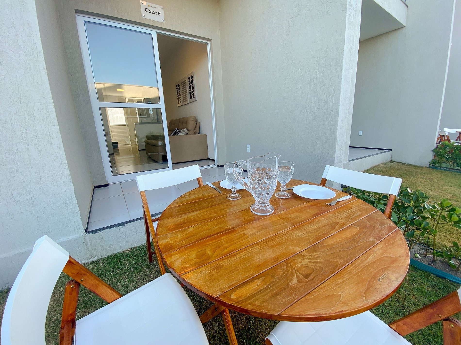 Casa em condomínio moderno, possui uma suíte com cama de casal, uma suíte com cama de solteiro e quarto com uma cama de solteiro, sala com sofá, varanda ampla com mesa e cadeira, cozinha com todos utensílios, roupas de cama e banho, produtos de higiene e um terraço amplo com mesa e vista do mar.