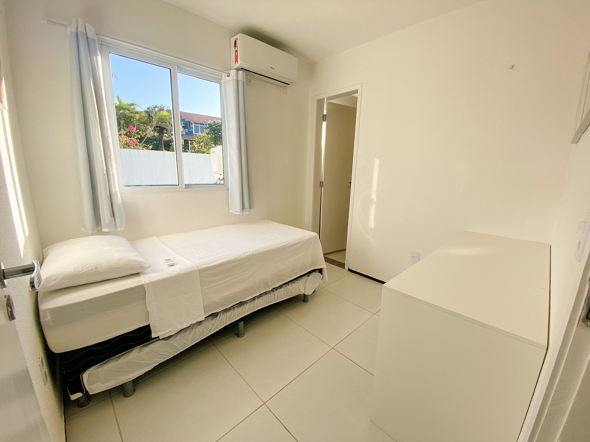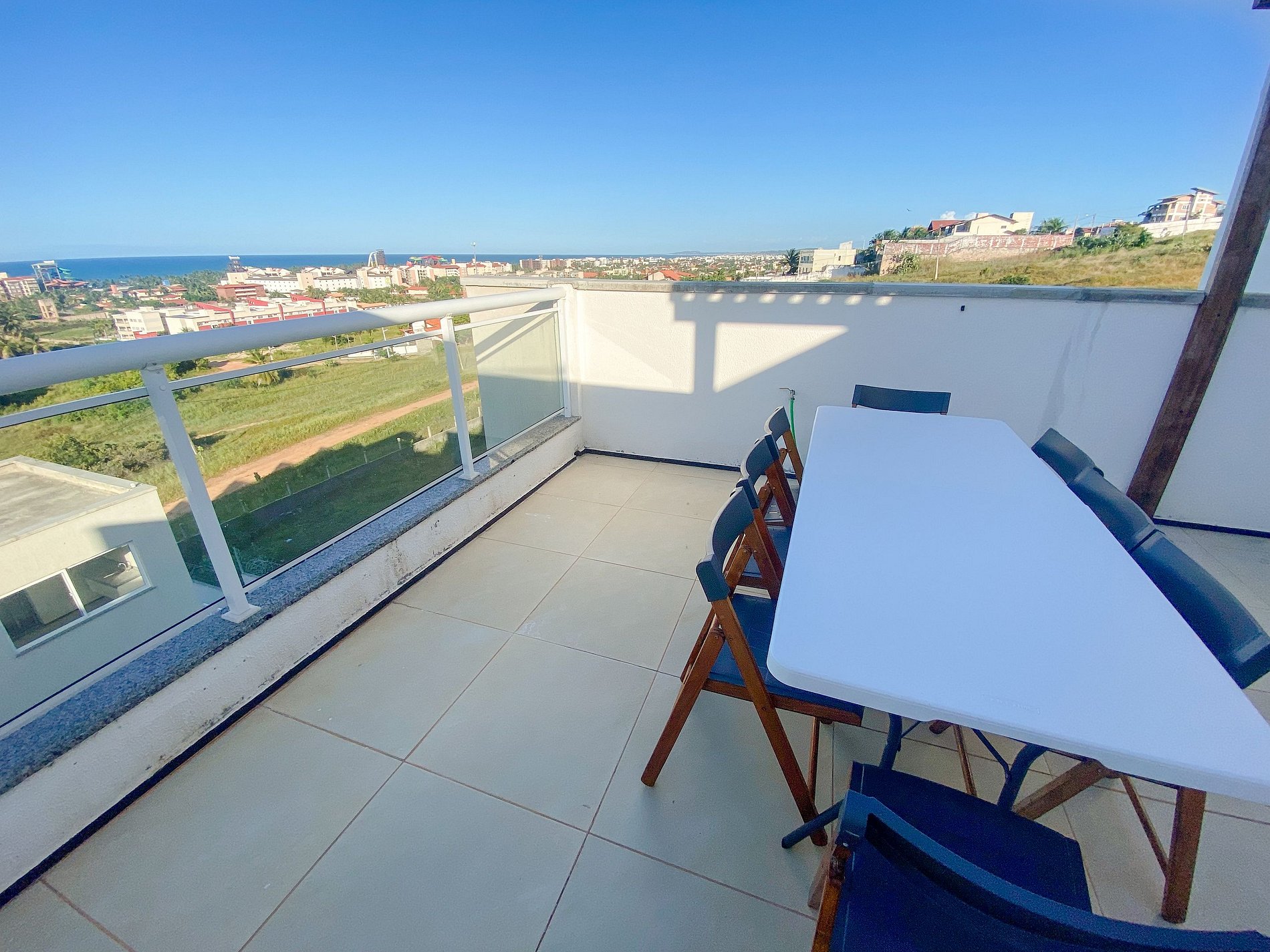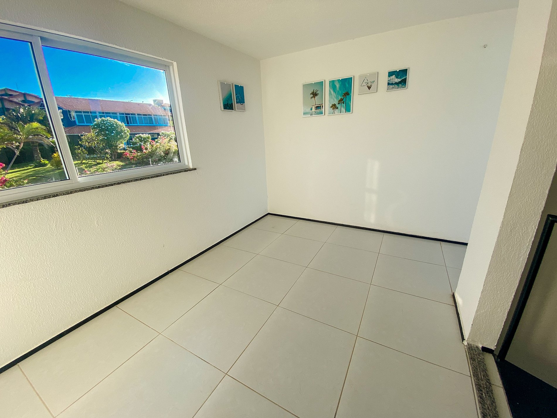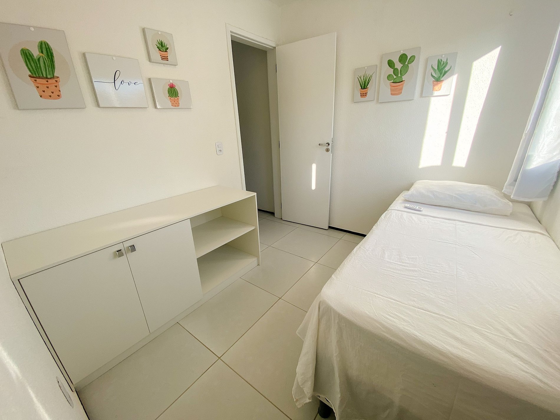 Casa em condomínio moderno, possui uma suíte com cama de casal, uma suíte com cama de solteiro e quarto com uma cama de solteiro, sala com sofá, varanda ampla com mesa e cadeira, cozinha com todos utensílios, roupas de cama e banho, produtos de higiene e um terraço amplo com mesa e vista do mar.