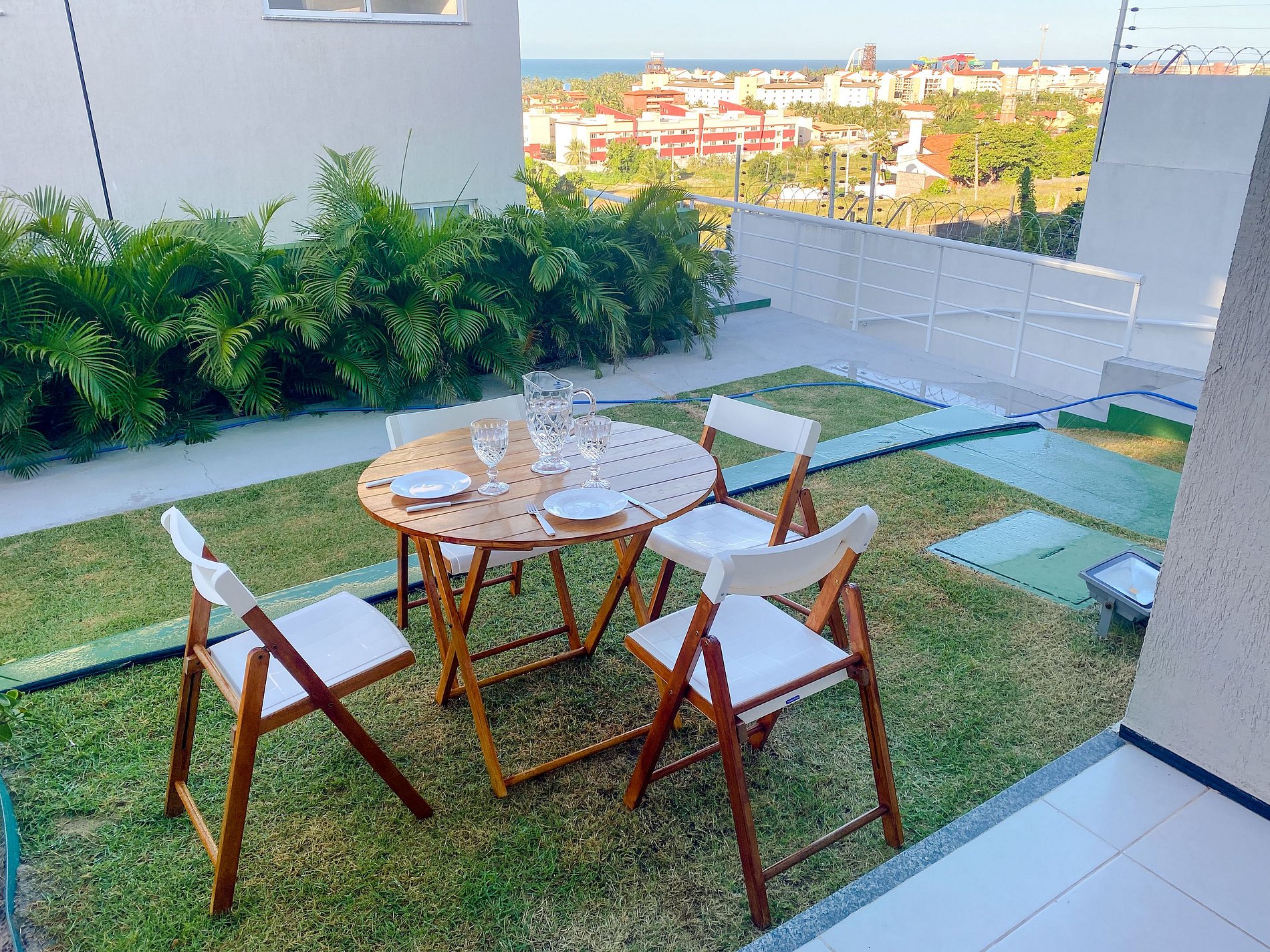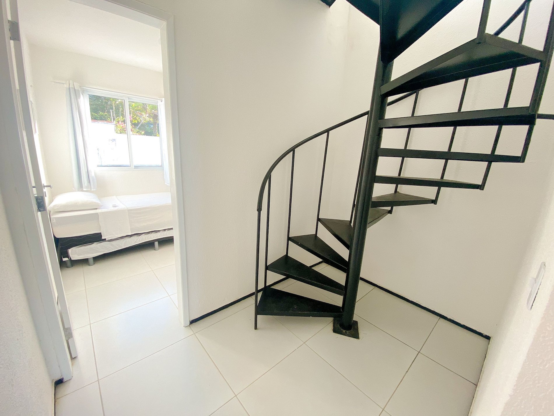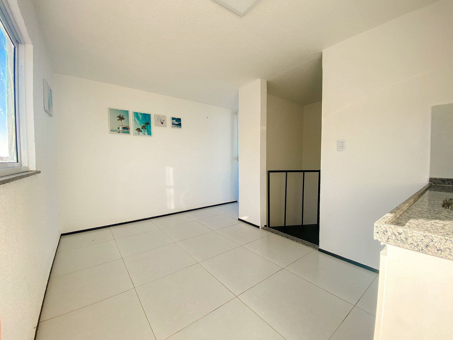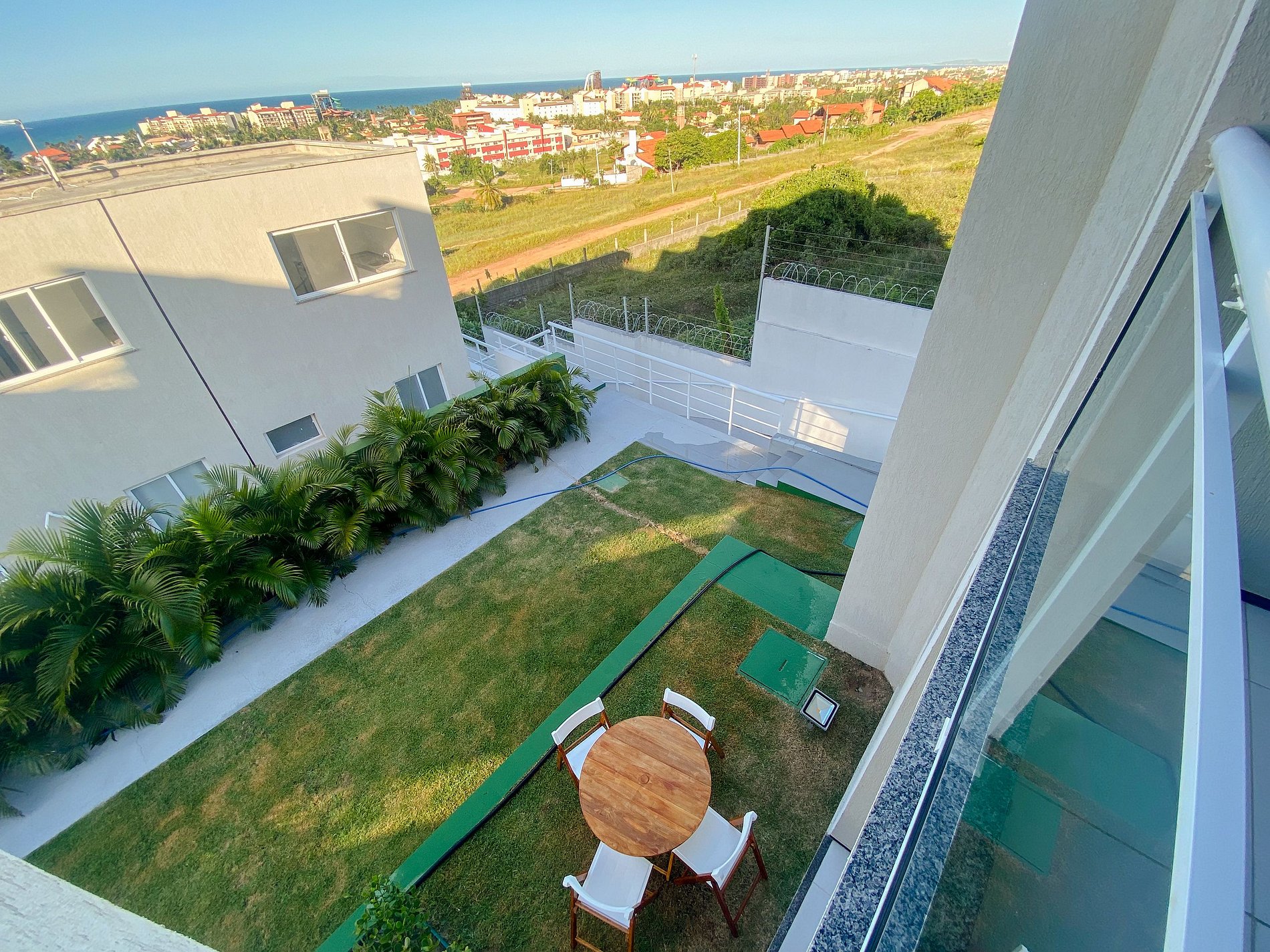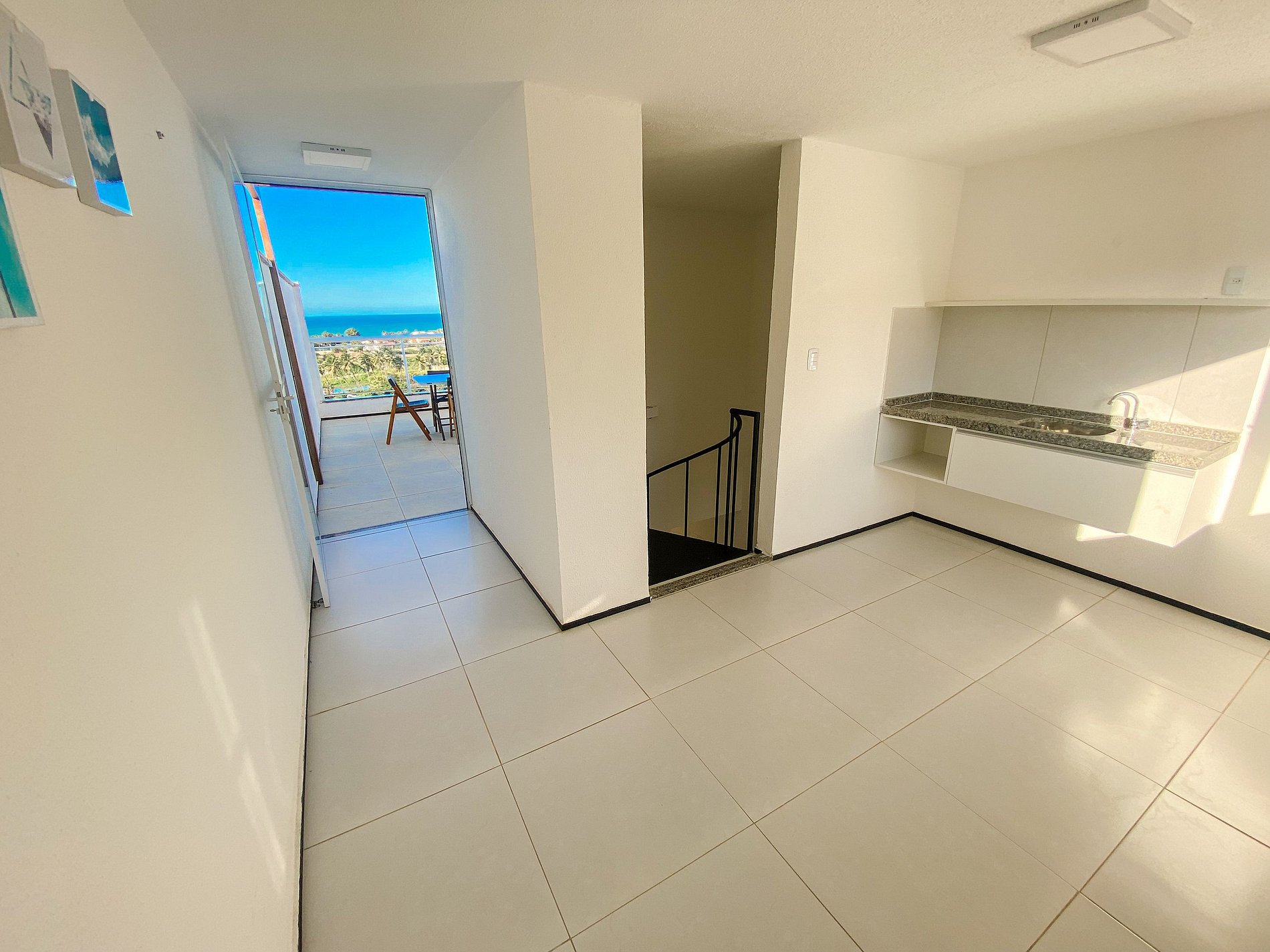 Casa em condomínio moderno, possui uma suíte com cama de casal, uma suíte com cama de solteiro e quarto com uma cama de solteiro, sala com sofá, varanda ampla com mesa e cadeira, cozinha com todos utensílios, roupas de cama e banho, produtos de higiene e um terraço amplo com mesa e vista do mar.